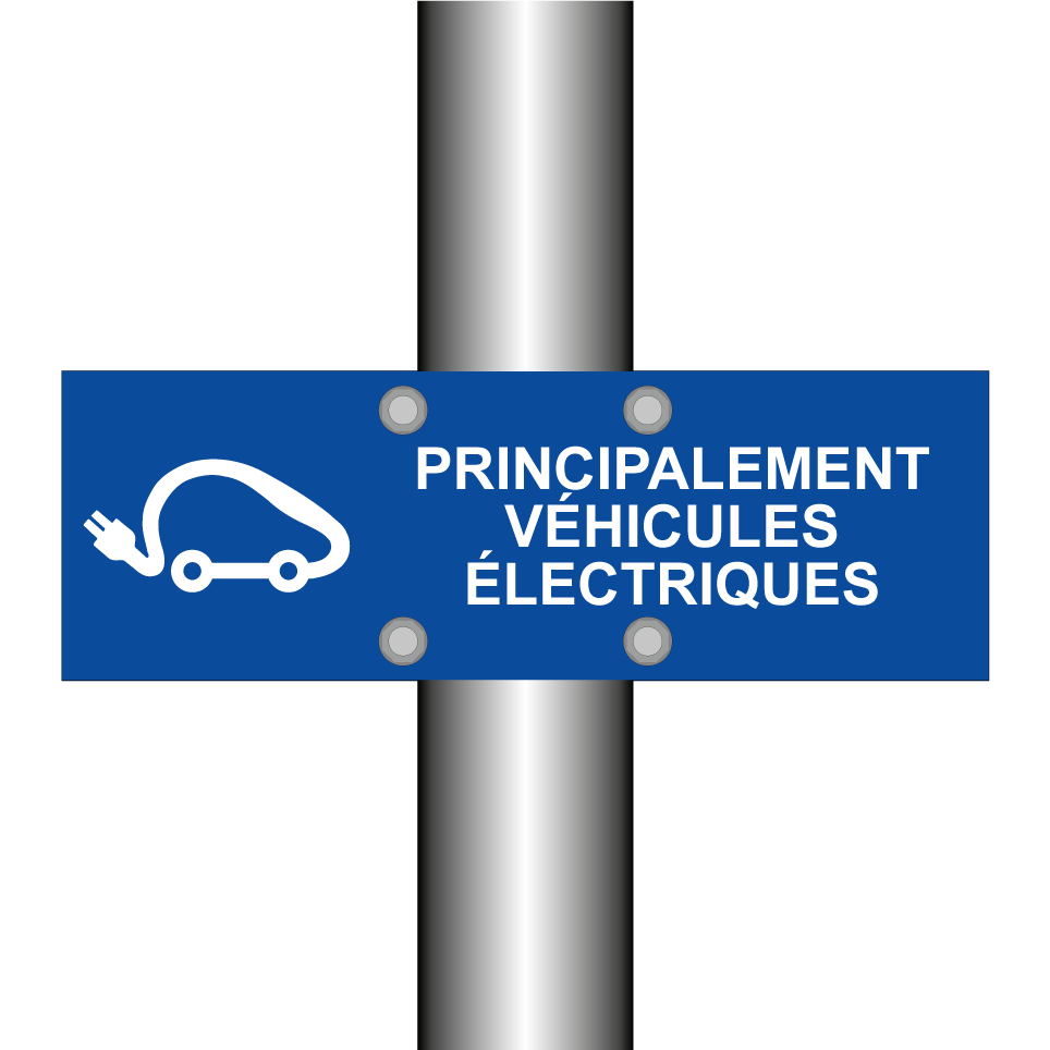 Panneau de stationnement avec le texte : "Principalement véhicules électriques" et une symbolique claire.