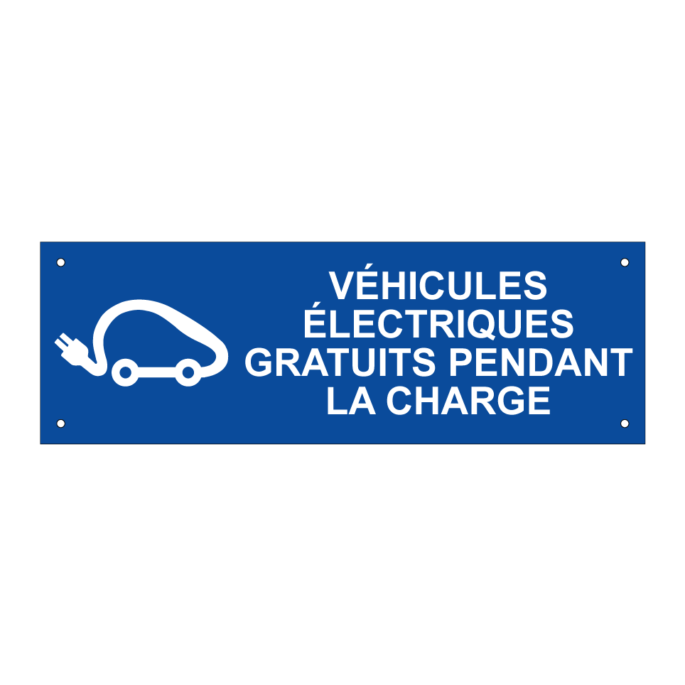 Panneau de stationnement avec le texte : "Véhicules électriques gratuits pendant la charge" et une symbolique claire.