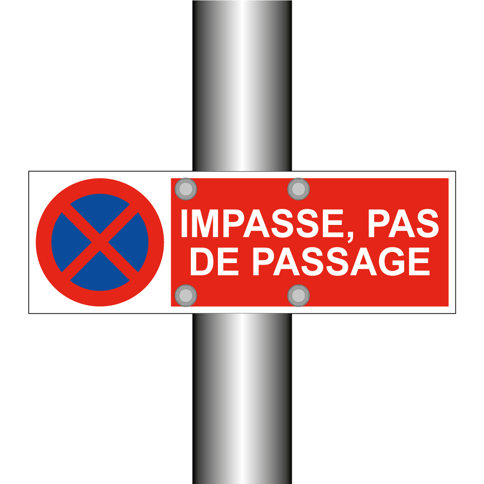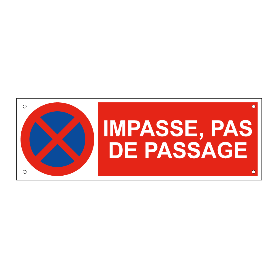 Panneau d'interdiction de stationner avec le texte : "Impasse, pas de passage" et une symbolique claire.