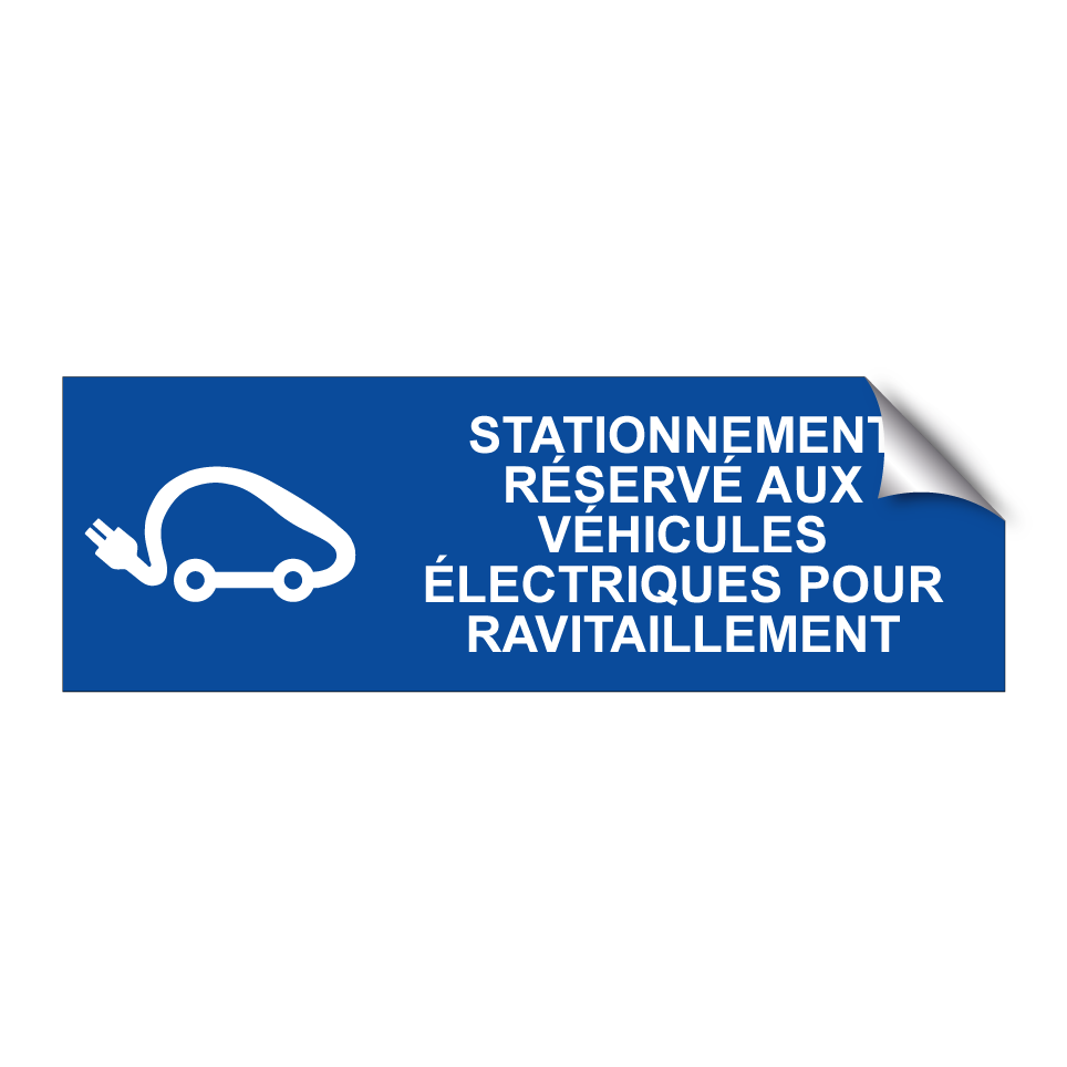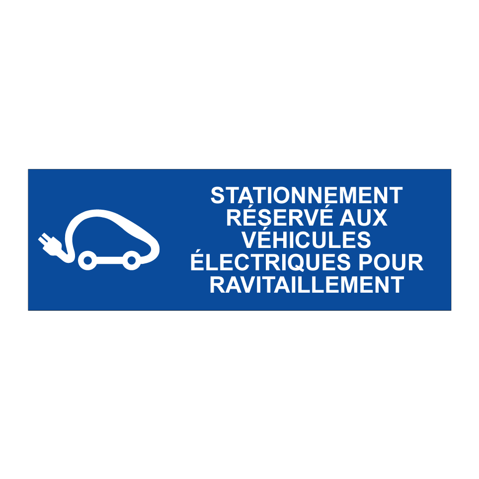 Panneau de stationnement avec le texte : "Stationnement réservé aux véhicules électriques pour ravitaillement." et une symbolique claire.