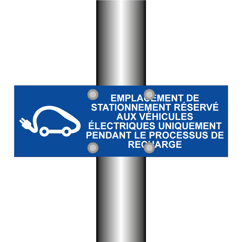 Panneau de stationnement avec le texte : "Emplacement de stationnement réservé aux véhicules électriques uniquement pendant le processus de recharge" et une symbolique claire.