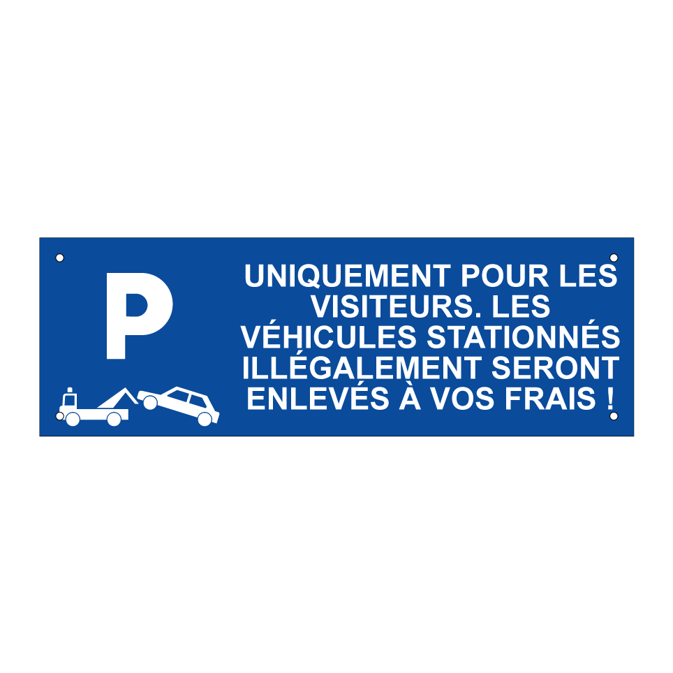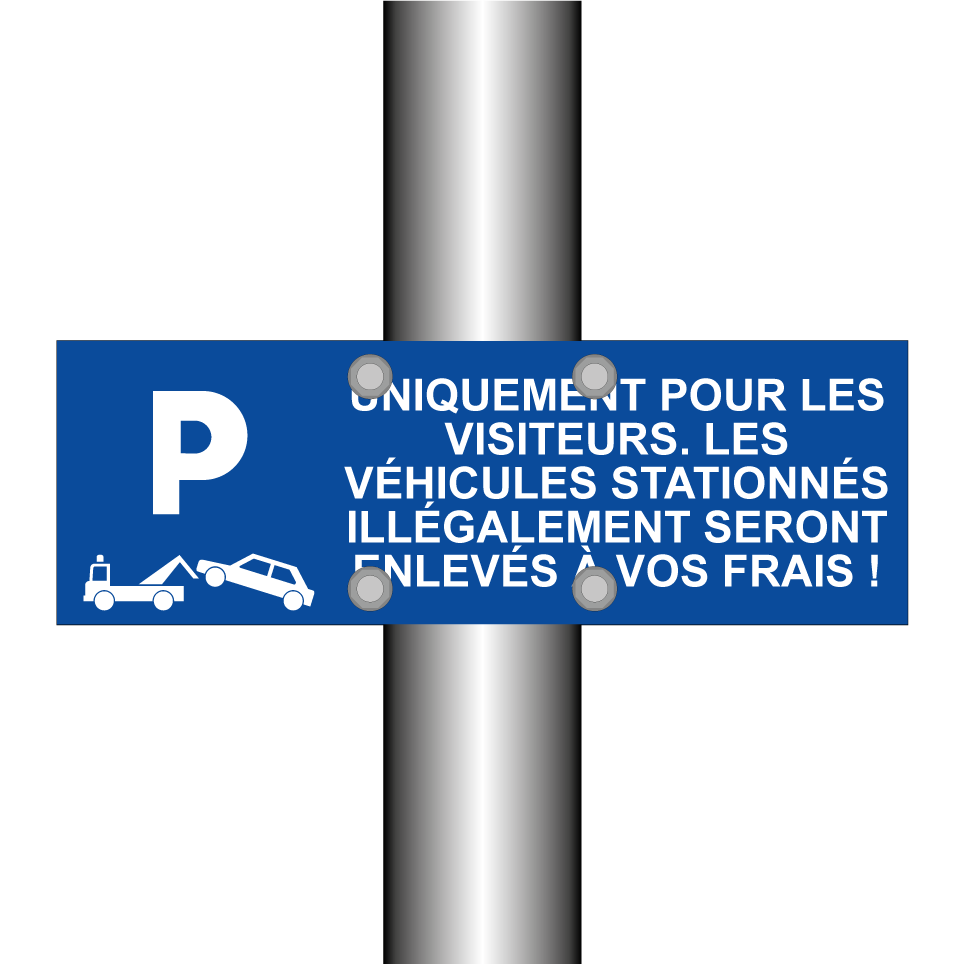 Panneau de stationnement avec le texte : "Uniquement pour les visiteurs. Les véhicules stationnés illégalement seront enlevés à vos frais !" et une symbolique claire.