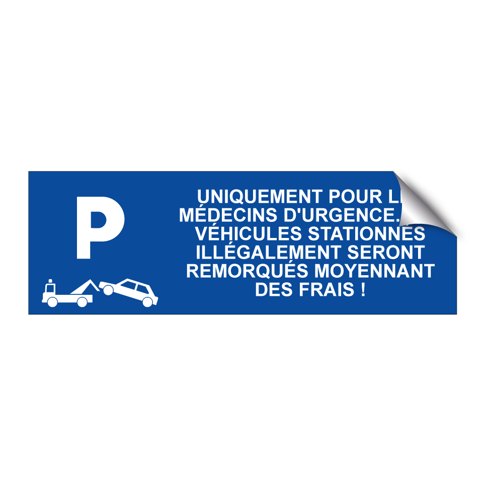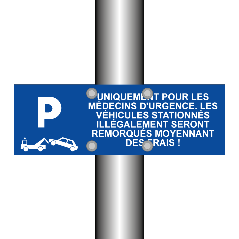 Panneau de stationnement avec le texte : "Uniquement pour les médecins d'urgence. Les véhicules stationnés illégalement seront remorqués moyennant des frais !" et une symbolique claire.