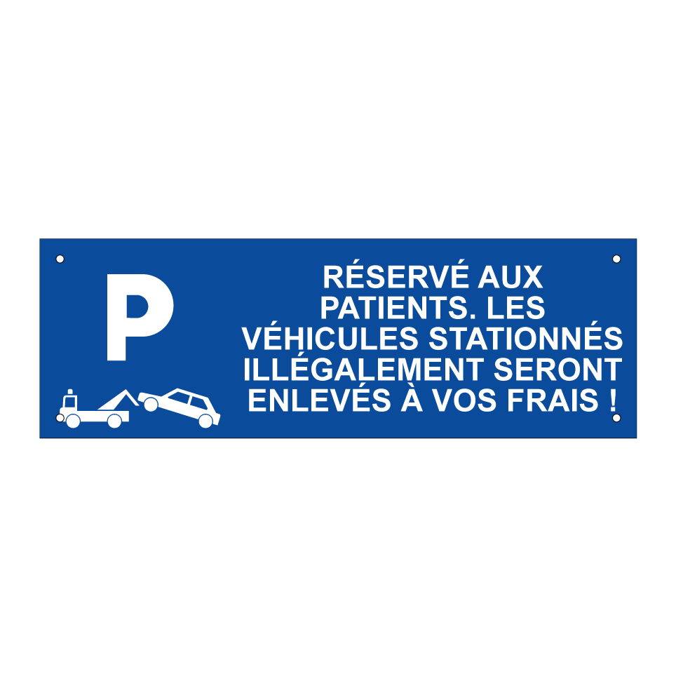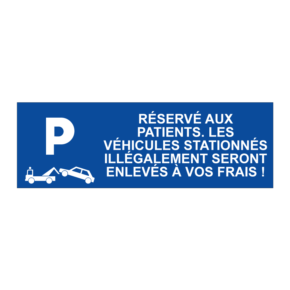 Panneau de stationnement avec le texte : "Réservé aux patients. Les véhicules stationnés illégalement seront enlevés à vos frais !" et une symbolique claire.