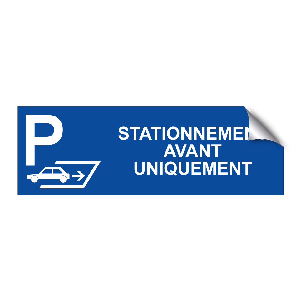 Panneau de stationnement avec le texte : "Stationnement avant uniquement" et une symbolique claire.