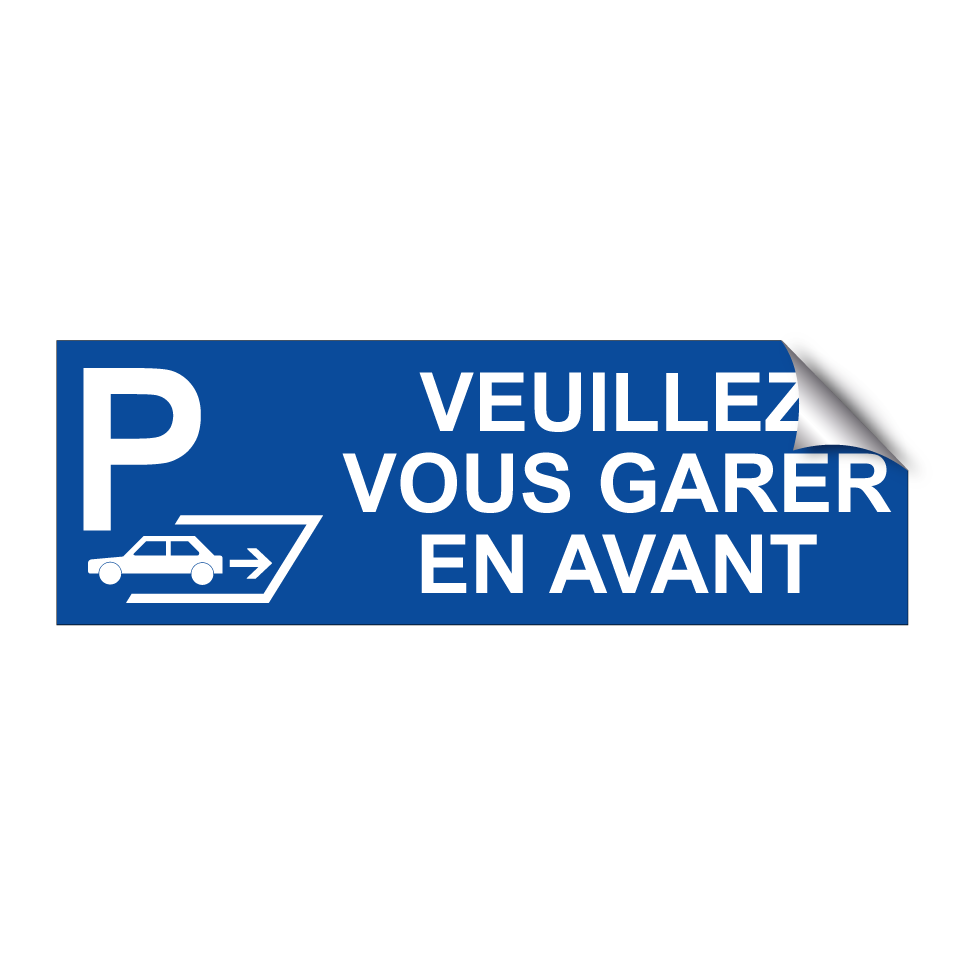 Panneau de stationnement avec le texte : "Veuillez vous garer en avant" et une symbolique claire.