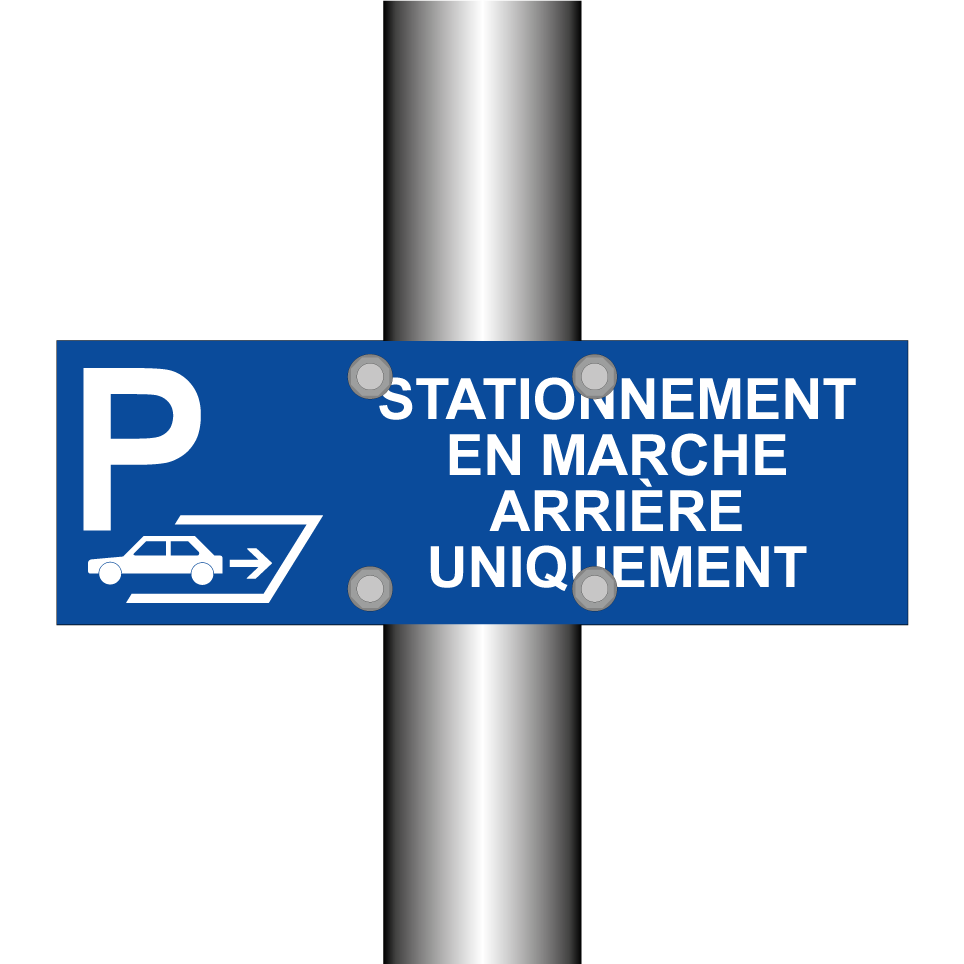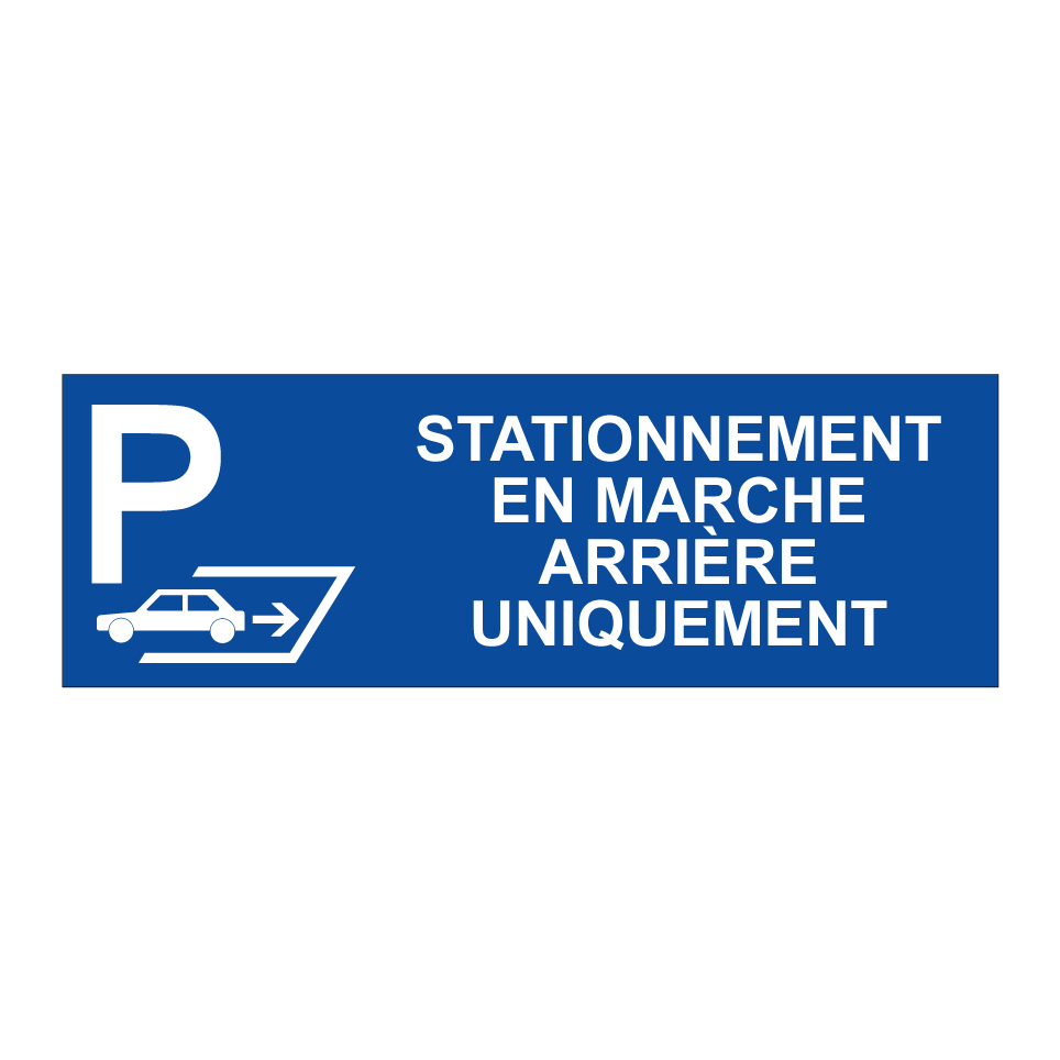 Panneau de stationnement avec le texte : "Stationnement en marche arrière uniquement" et une symbolique claire.