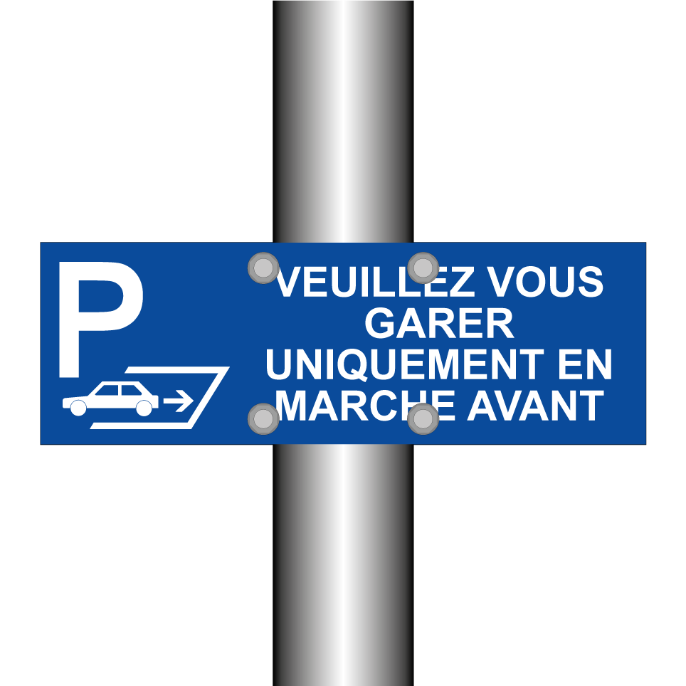 Panneau de stationnement avec le texte : "Veuillez vous garer uniquement en marche avant" et une symbolique claire.