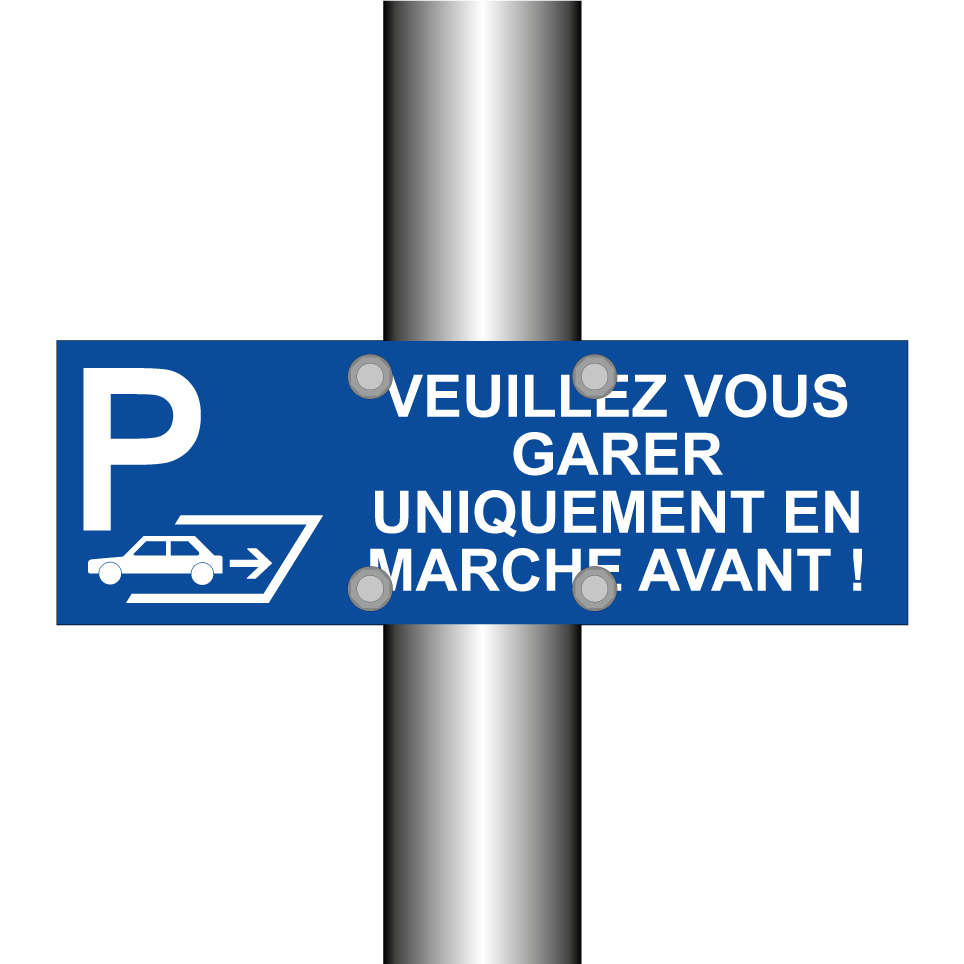 Panneau de stationnement avec le texte : "Veuillez vous garer uniquement en marche avant !" et une symbolique claire.