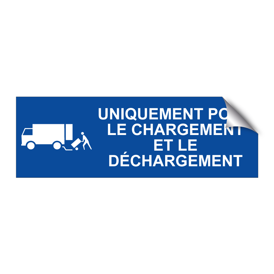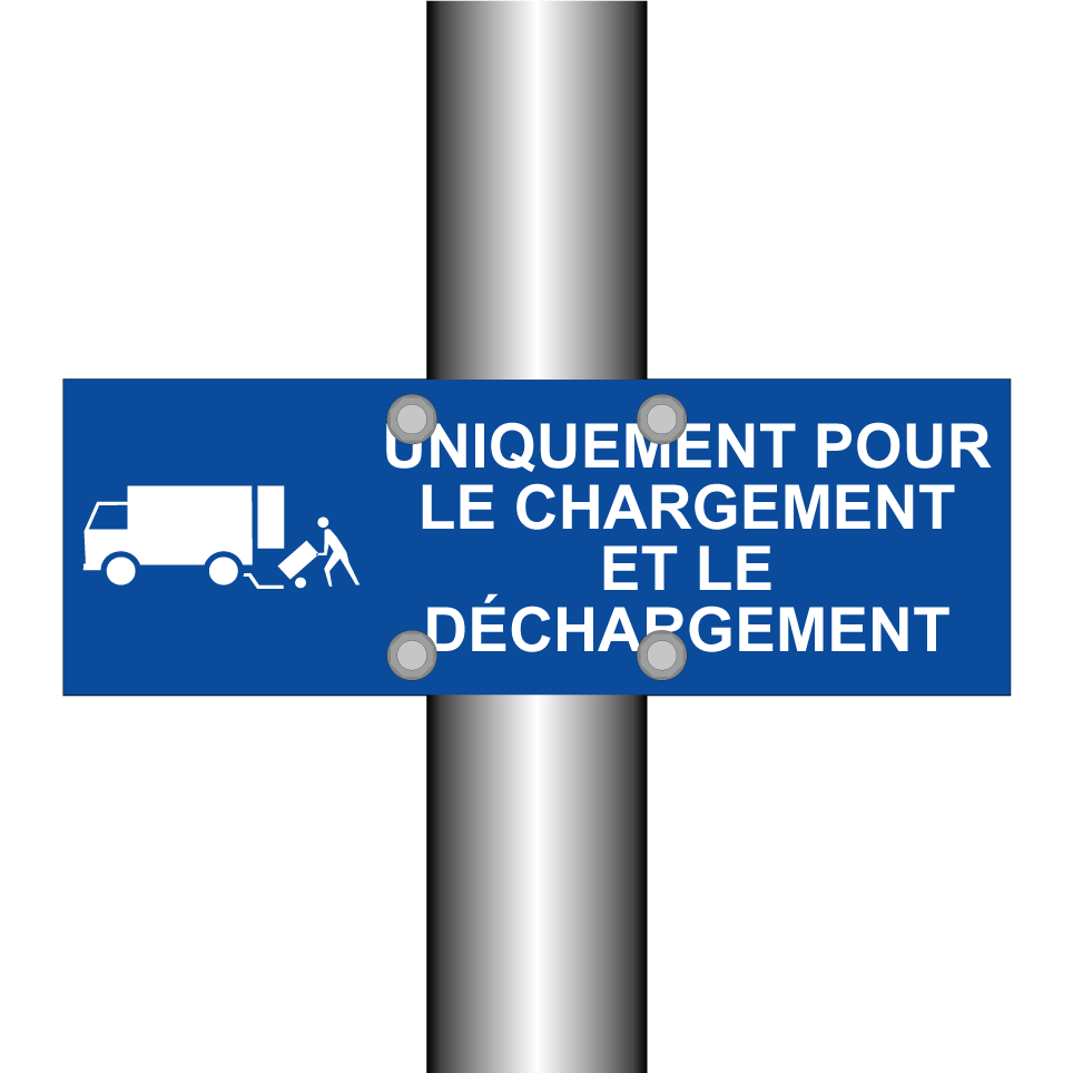 Panneau de stationnement avec le texte : "Uniquement pour le chargement et le déchargement" et une symbolique claire.