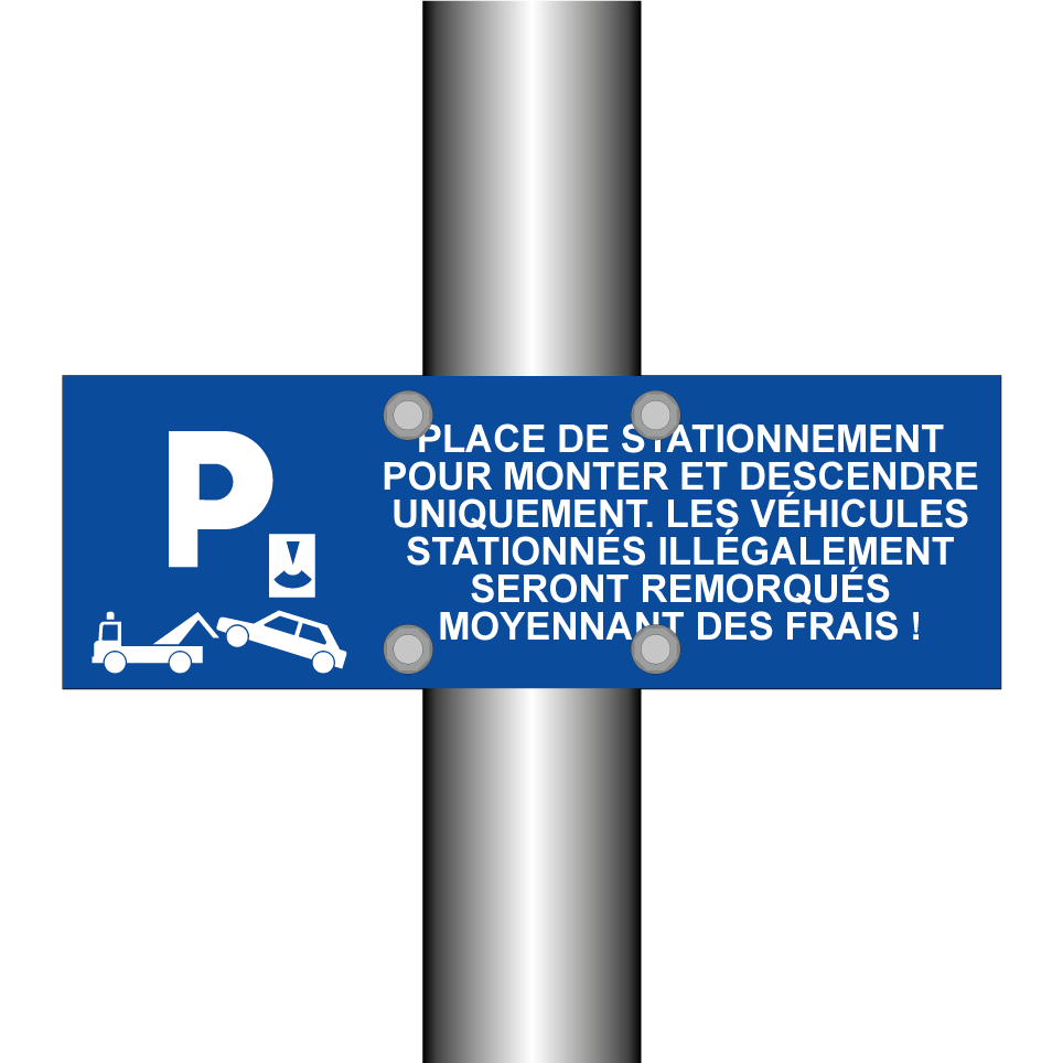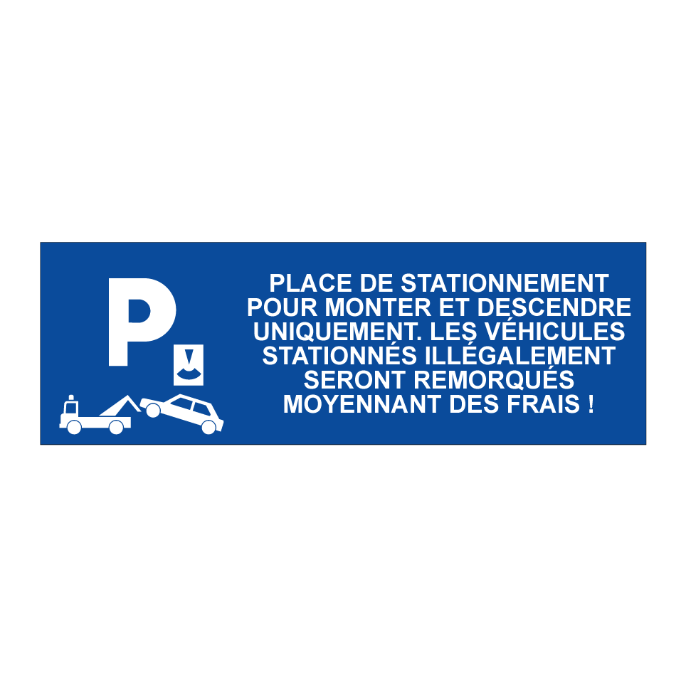 Panneau de stationnement avec le texte : "Place de stationnement pour monter et descendre uniquement. Les véhicules stationnés illégalement seront remorqués moyennant des frais !" et une symbolique claire.