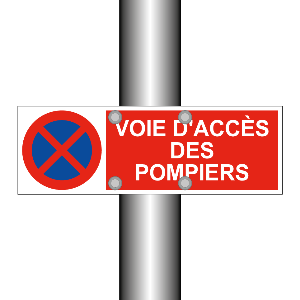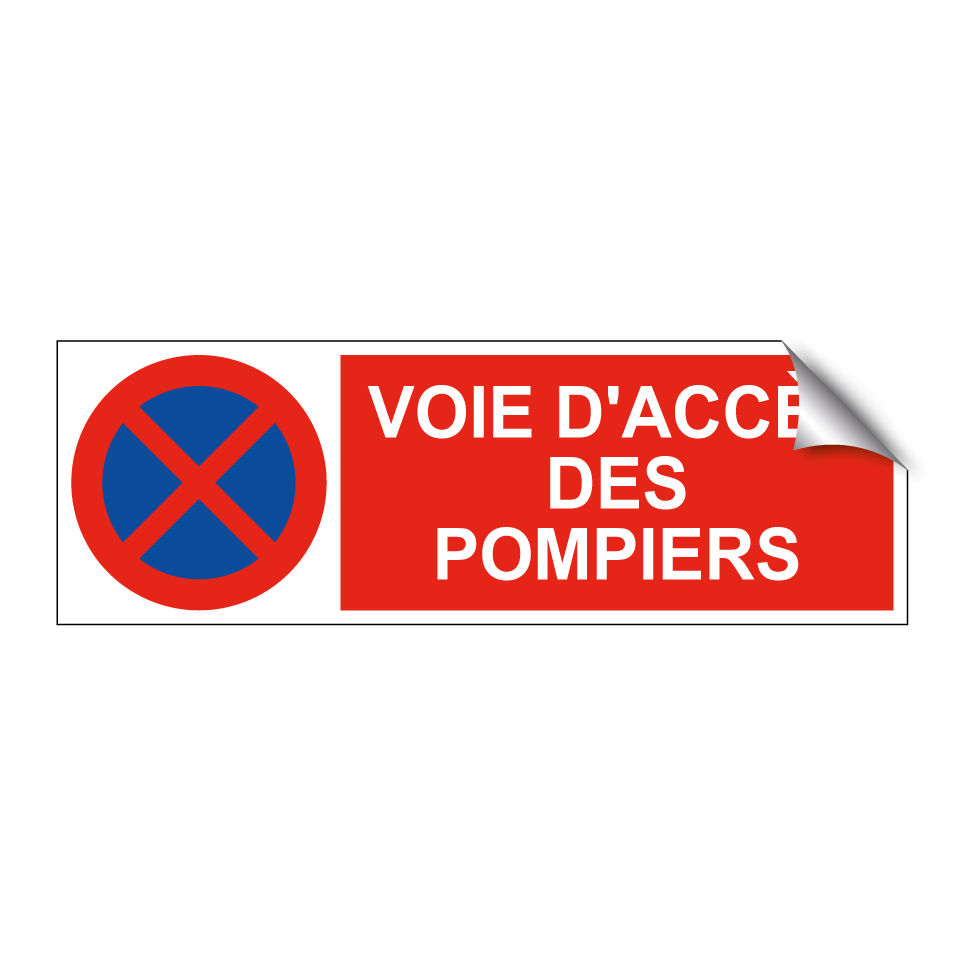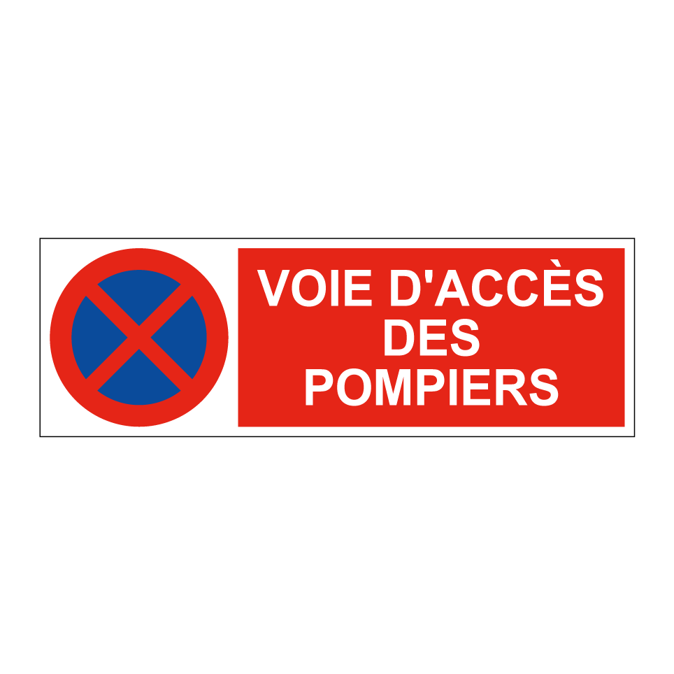 Panneau d'interdiction de stationner avec le texte : "Voie d'accès des pompiers" et une symbolique claire.