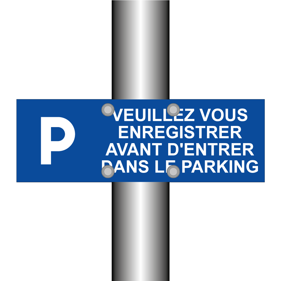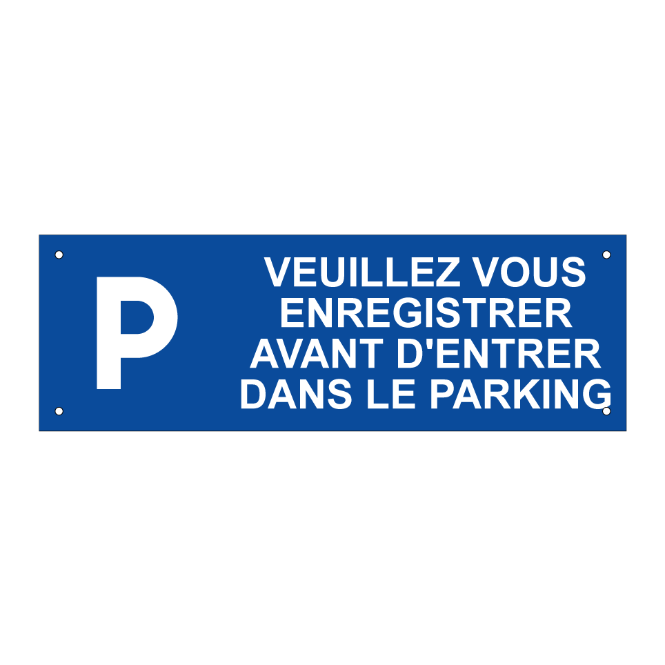 Panneau de stationnement avec le texte : "Veuillez vous enregistrer avant d'entrer dans le parking." et une symbolique claire.