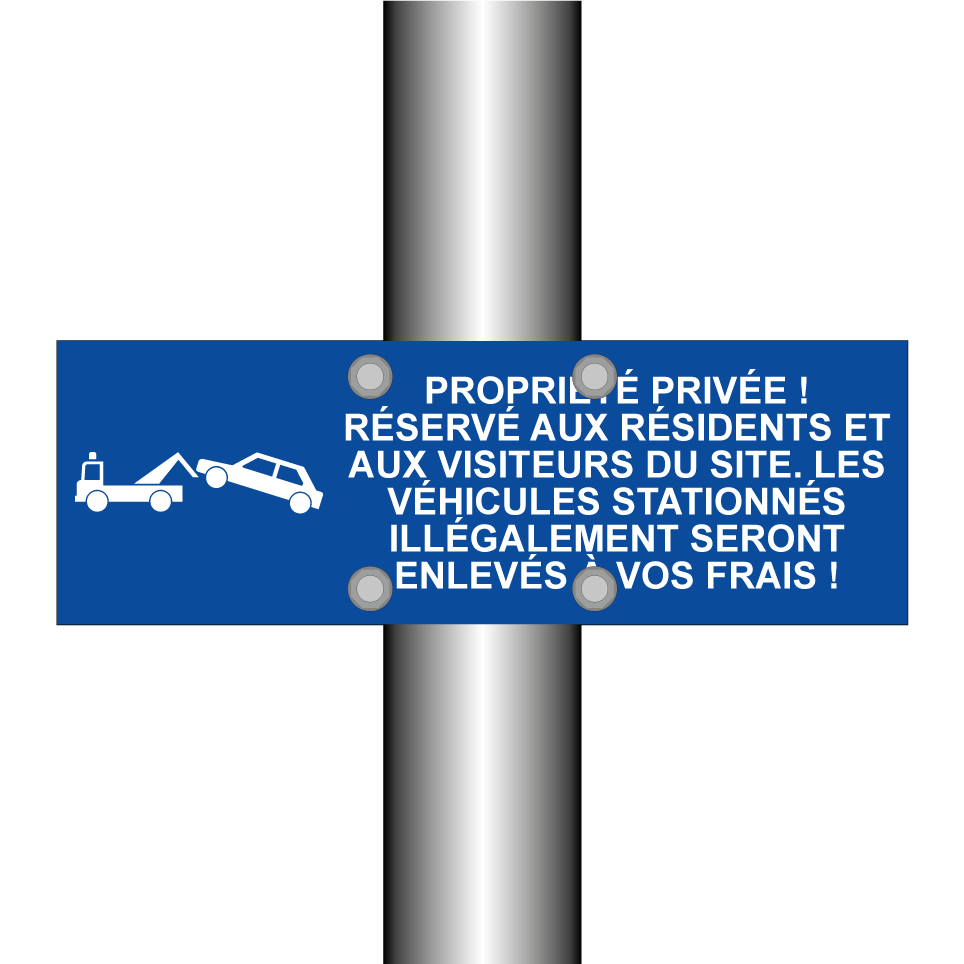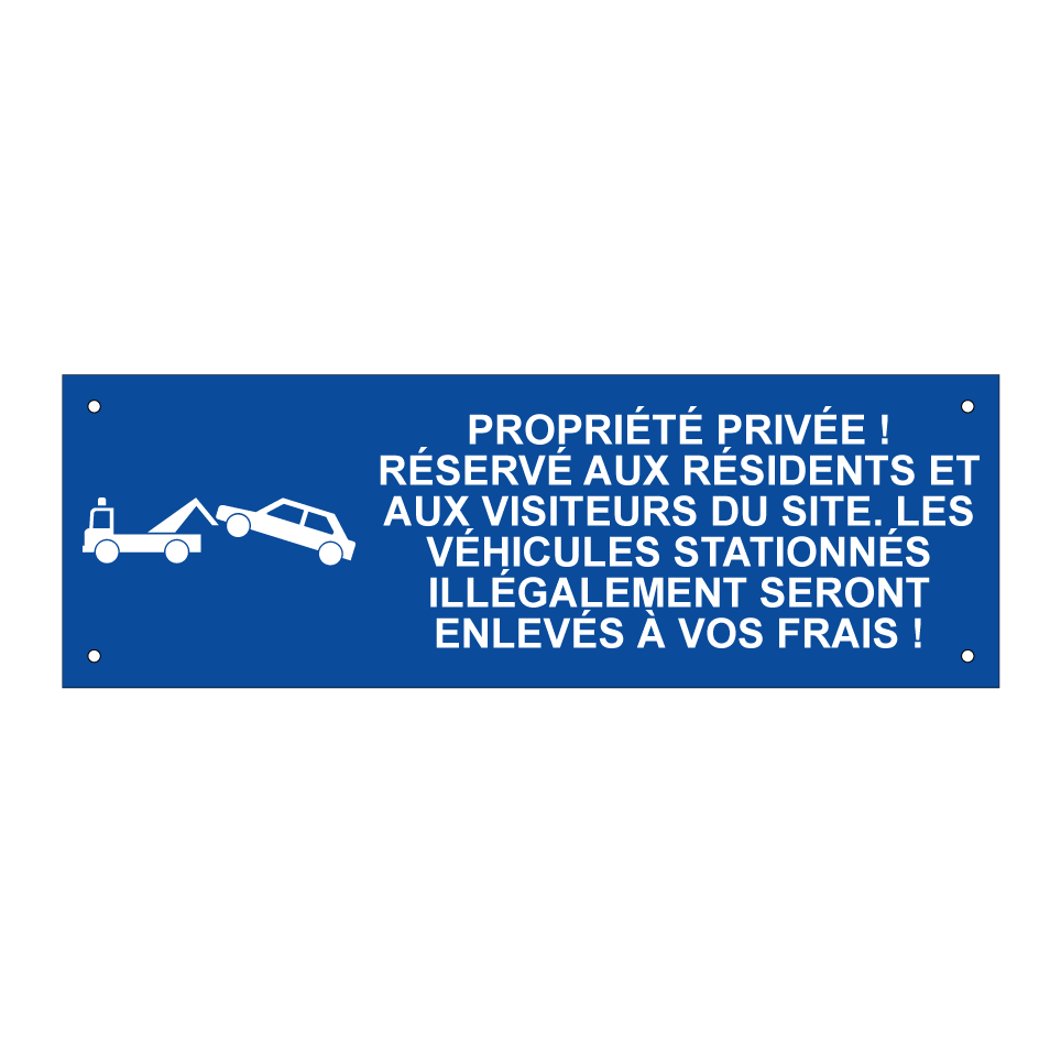 Panneau de stationnement avec le texte : "Propriété privée ! Réservé aux résidents et aux visiteurs du site. Les véhicules stationnés illégalement seront enlevés à vos frais !" et une symbolique claire.