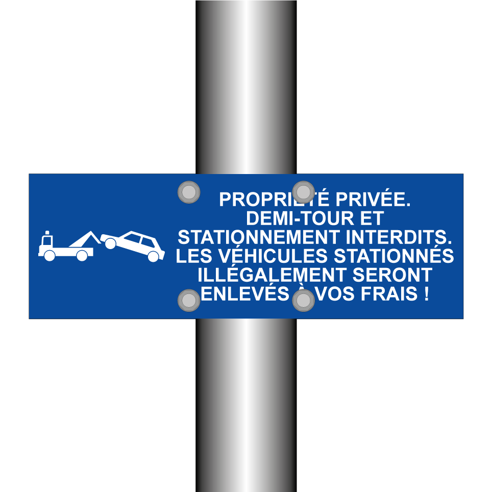 Panneau de stationnement avec le texte : "Propriété privée. Demi-tour et stationnement interdits. Les véhicules stationnés illégalement seront enlevés à vos frais !" et une symbolique claire.