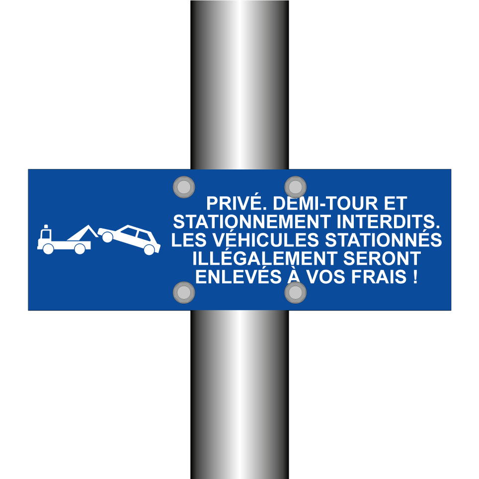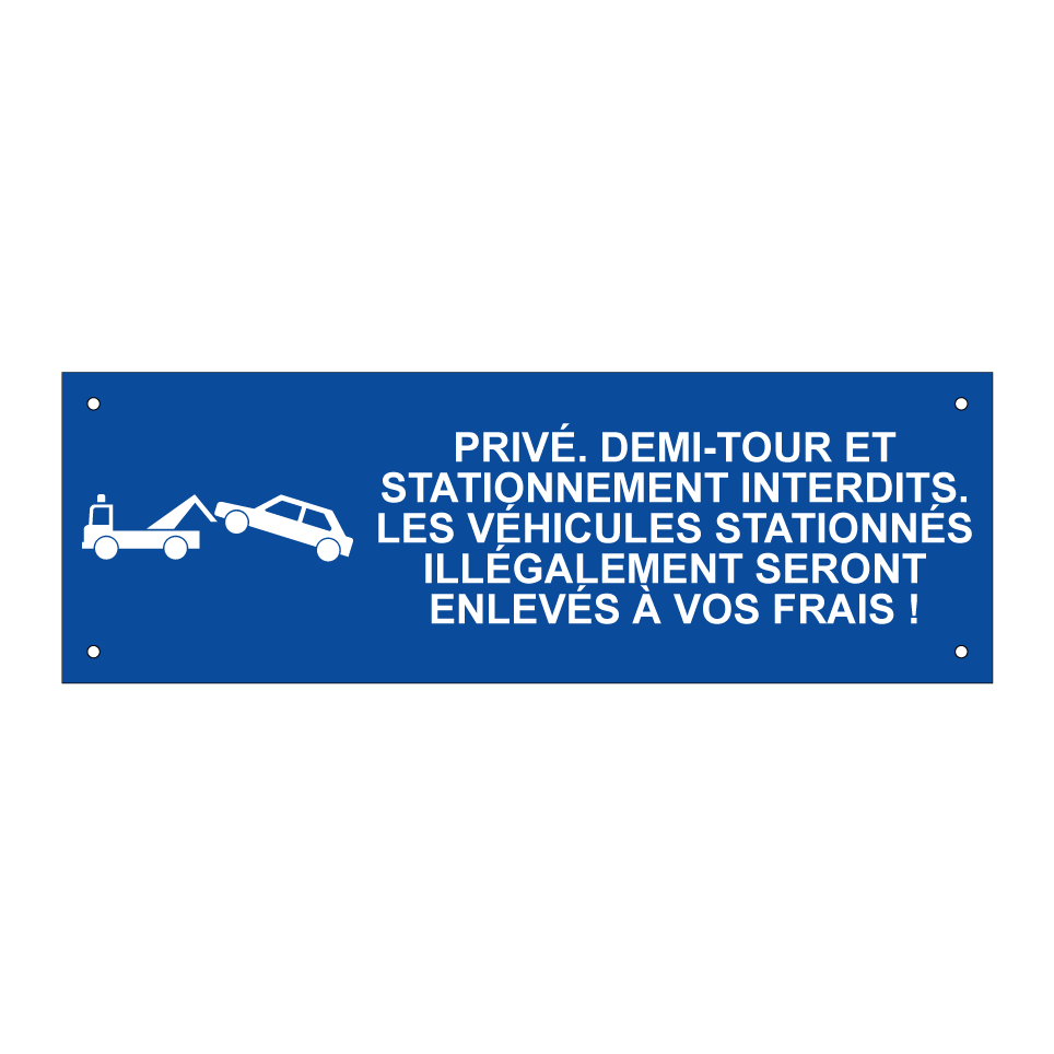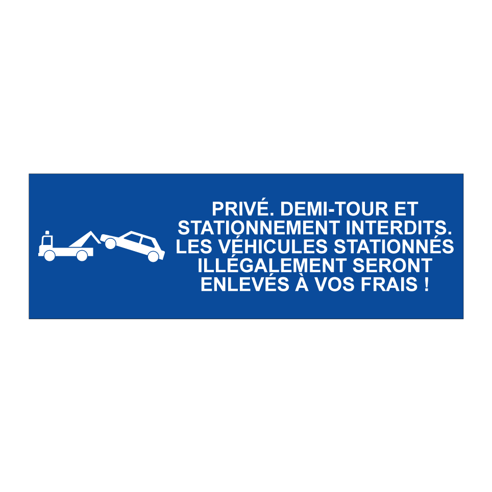 Panneau de stationnement avec le texte : "Privé. Demi-tour et stationnement interdits. Les véhicules stationnés illégalement seront enlevés à vos frais !" et une symbolique claire.