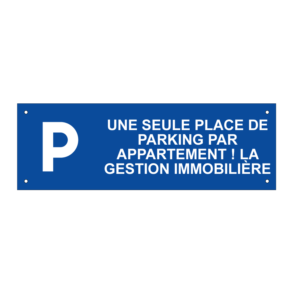 Ce panneau de stationnement est idéal pour les complexes résidentiels et les immeubles d'appartements. Il sert à rappeler aux résidents et visiteurs qu'une seule place de stationnement est attribuée par logement, assurant ainsi une gestion efficace des espaces de stationnement. Avec son fond bleu et son texte blanc, il est facilement visible et lisible, même de loin. Ce panneau peut être installé à l'entrée du parking ou à proximité des places de stationnement pour garantir le respect des règles de stationnement.