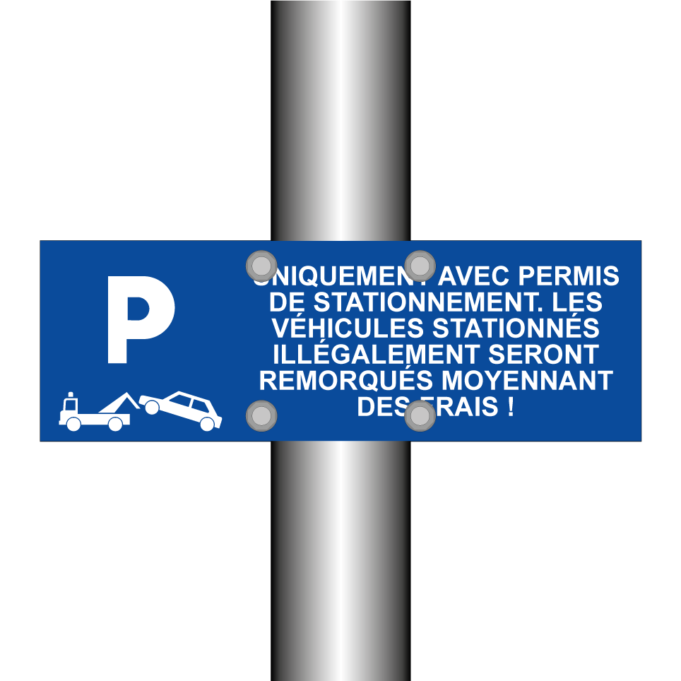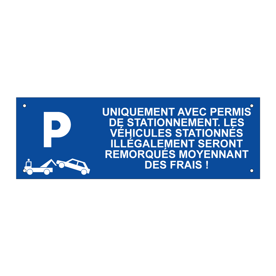 Panneau de stationnement avec le texte : "Uniquement avec permis de stationnement. Les véhicules stationnés illégalement seront remorqués moyennant des frais !" et une symbolique claire.