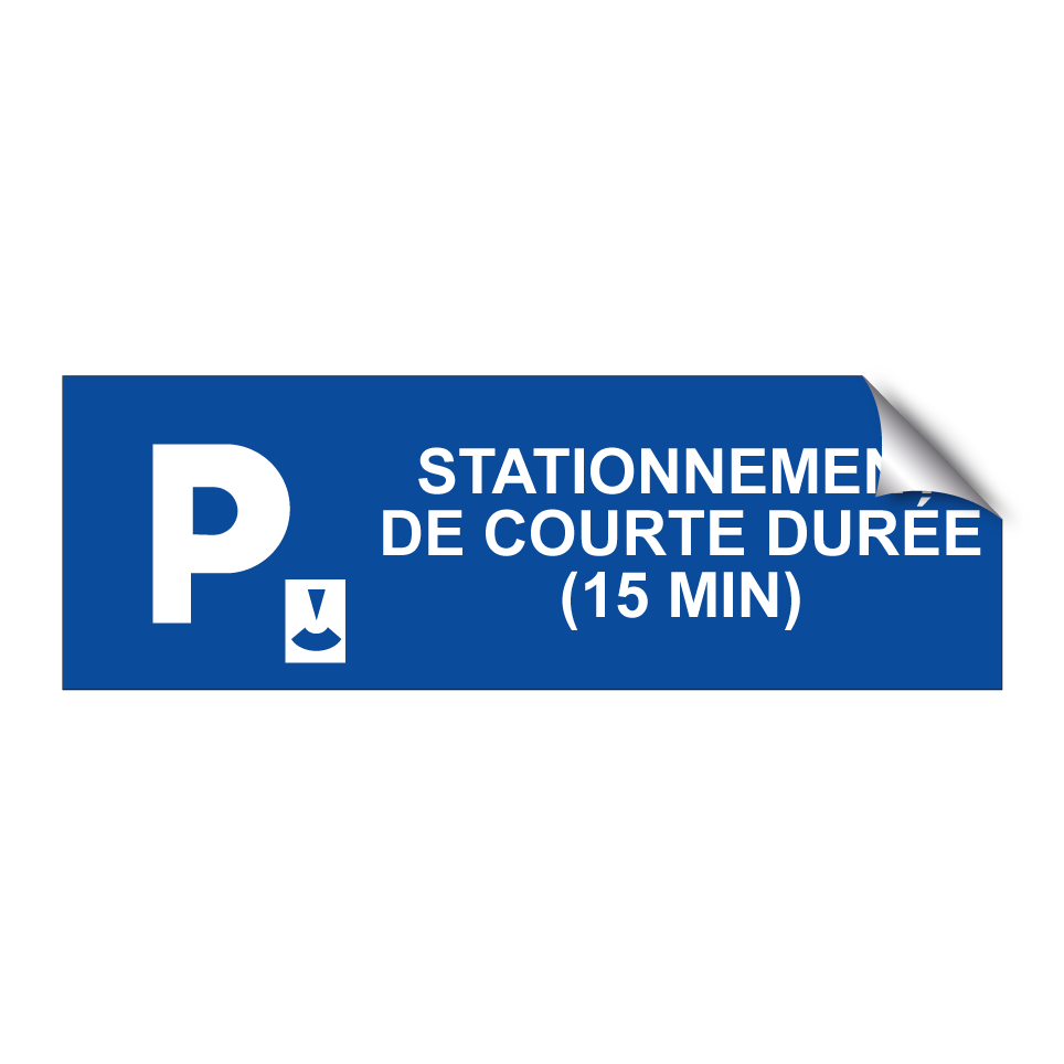 Panneau de stationnement avec le texte : "Stationnement de courte durée (15 min)" et une symbolique claire.