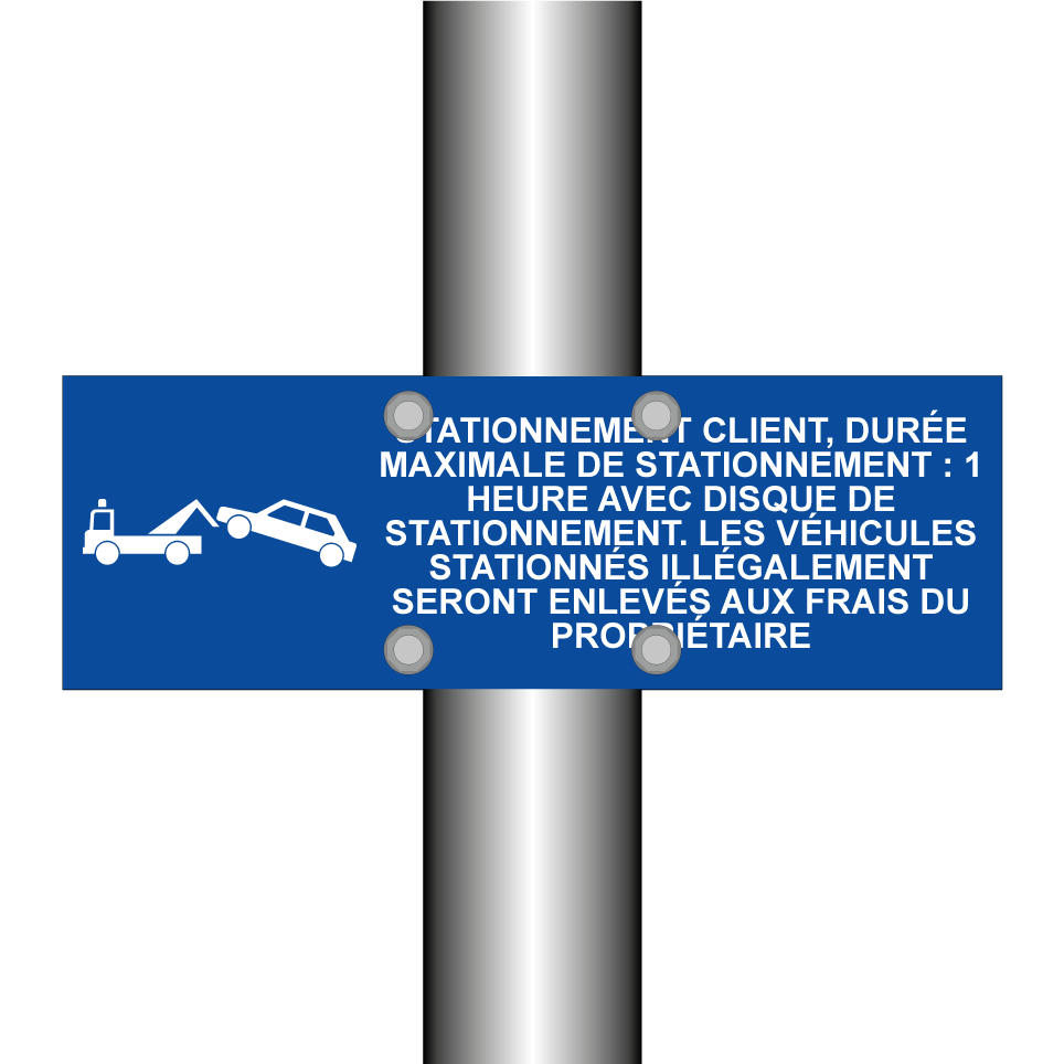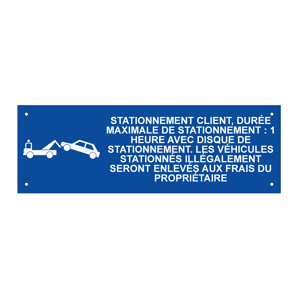 Panneau de stationnement avec le texte : "Stationnement client, durée maximale de stationnement : 1 heure avec disque de stationnement. Les véhicules stationnés illégalement seront enlevés aux frais du propriétaire." et une symbolique claire.