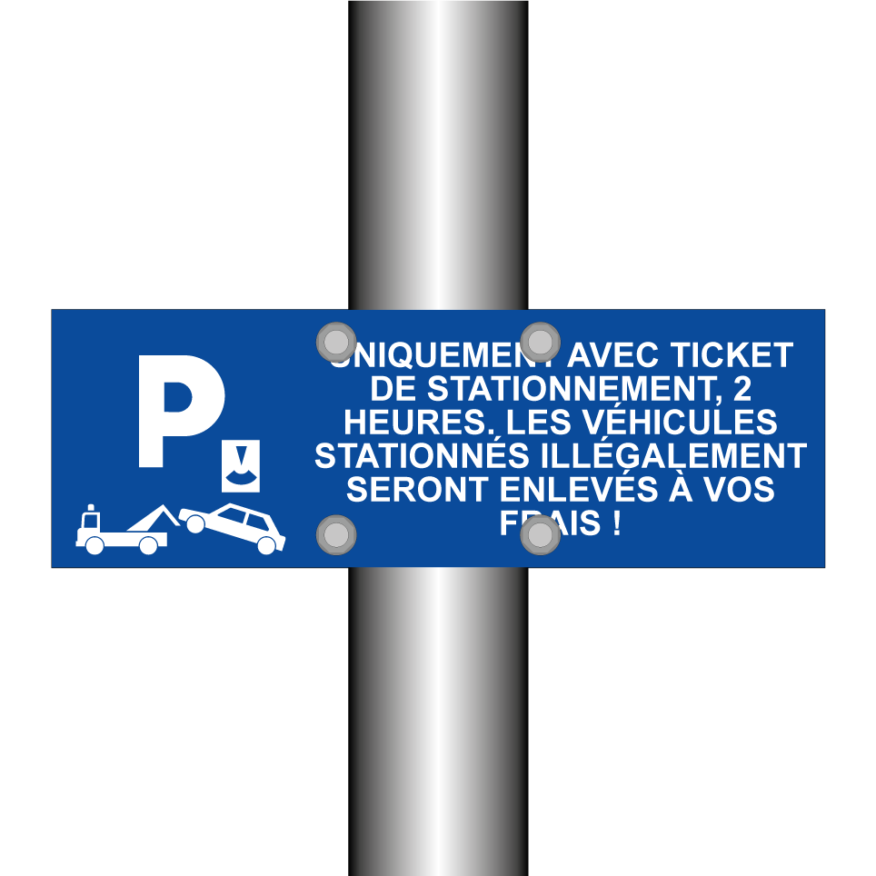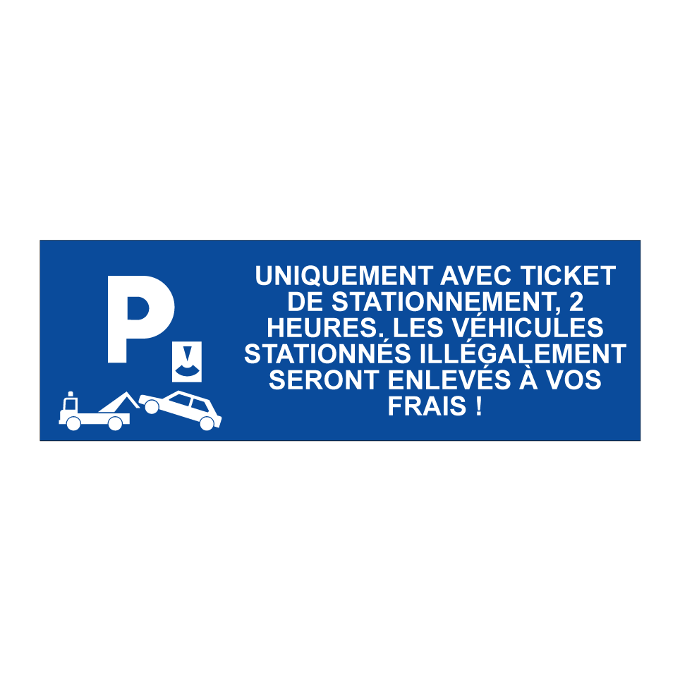 Panneau de stationnement avec le texte : "Uniquement avec ticket de stationnement, 2 heures. Les véhicules stationnés illégalement seront enlevés à vos frais !" et une symbolique claire.