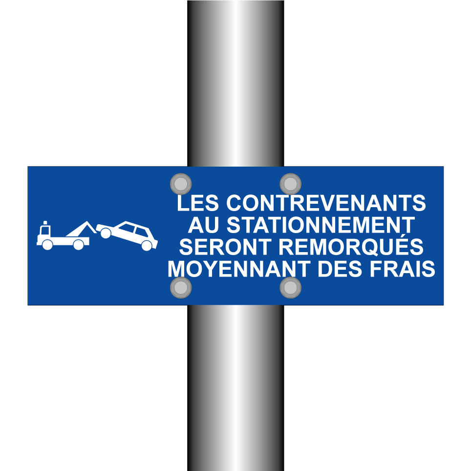 Panneau de stationnement avec le texte : "Les contrevenants au stationnement seront remorqués moyennant des frais." et une symbolique claire.