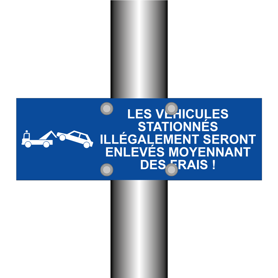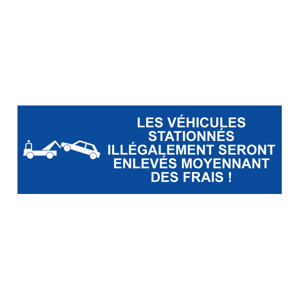 Panneau de stationnement avec le texte : "Les véhicules stationnés illégalement seront enlevés moyennant des frais !" et une symbolique claire.