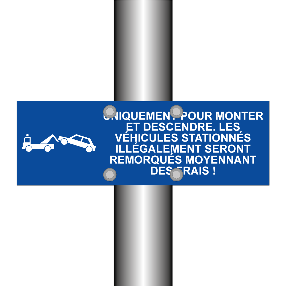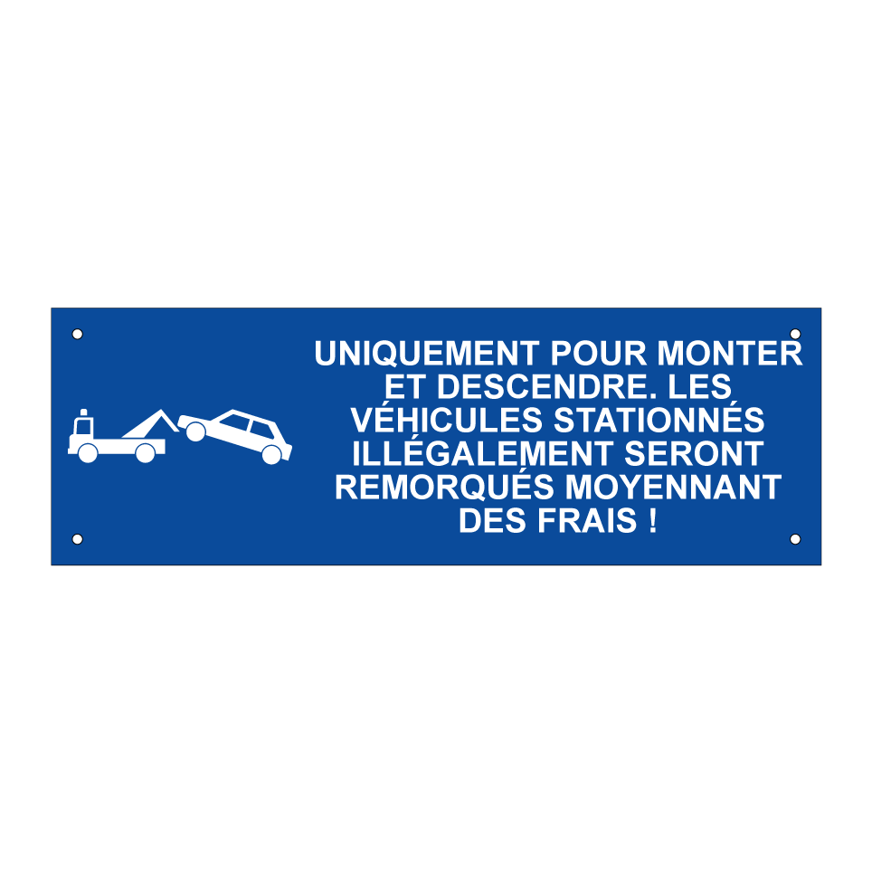 Panneau de stationnement avec le texte : "Uniquement pour monter et descendre. Les véhicules stationnés illégalement seront remorqués moyennant des frais !" et une symbolique claire.