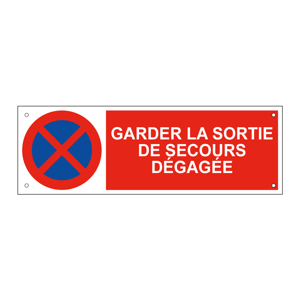 Panneau d'interdiction de stationner avec le texte : "Garder la sortie de secours dégagée" et une symbolique claire.