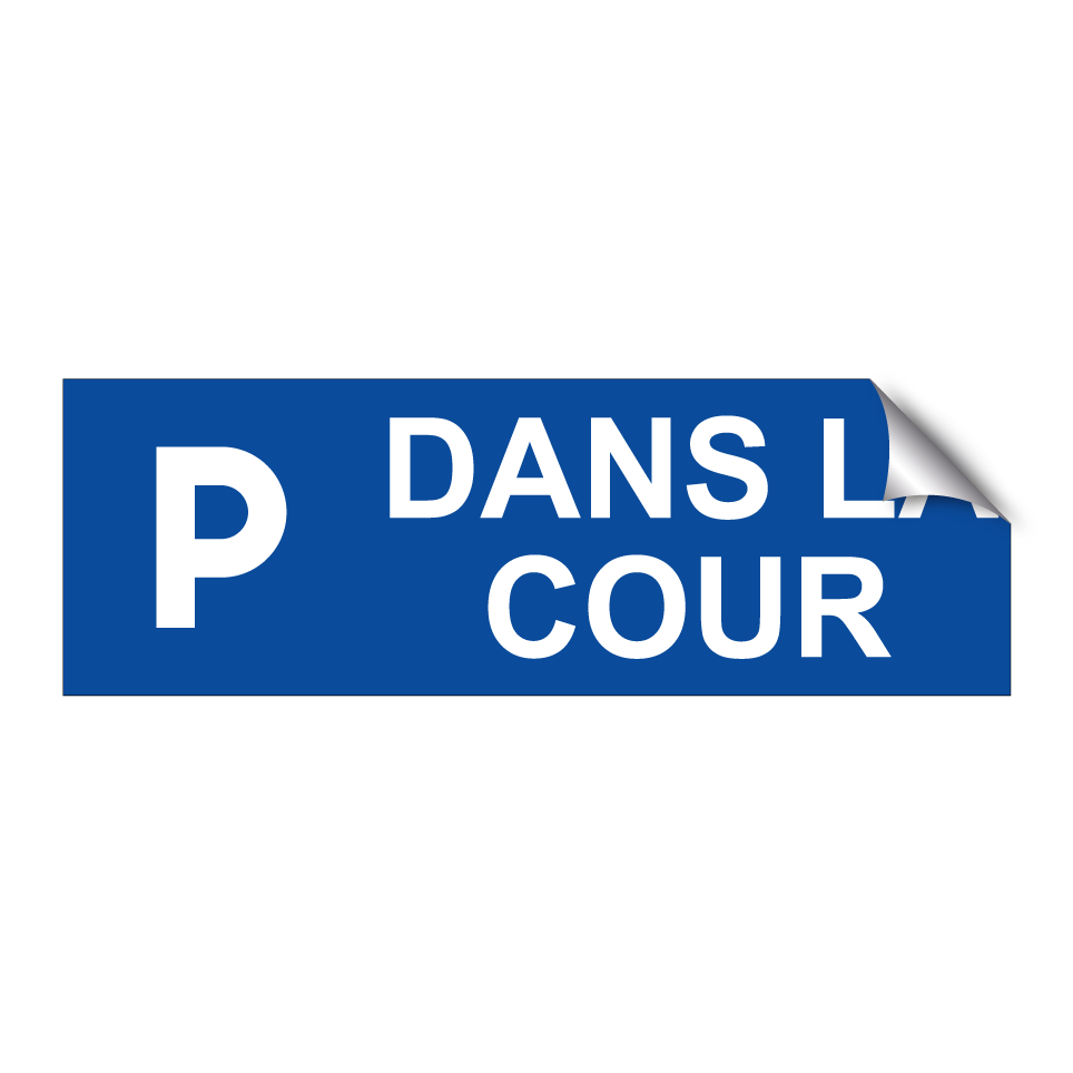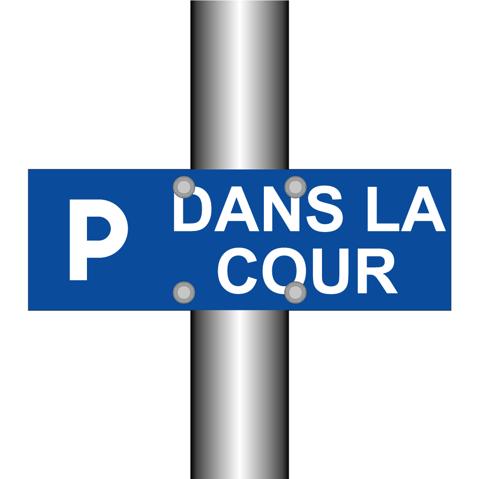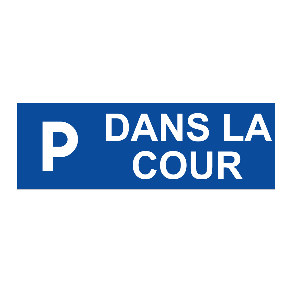 Panneau de stationnement avec le texte : "Dans la cour" et une symbolique claire.