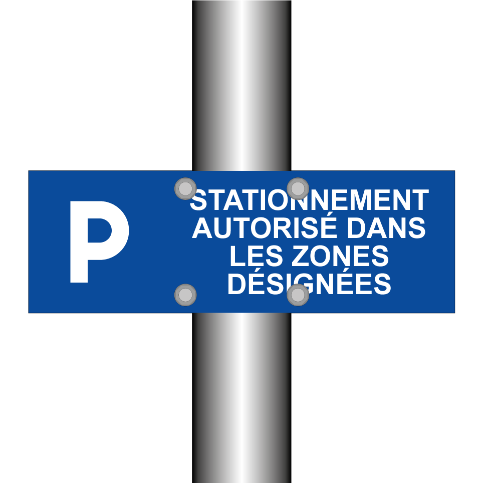Panneau de stationnement avec le texte : "Stationnement autorisé dans les zones désignées" et une symbolique claire.