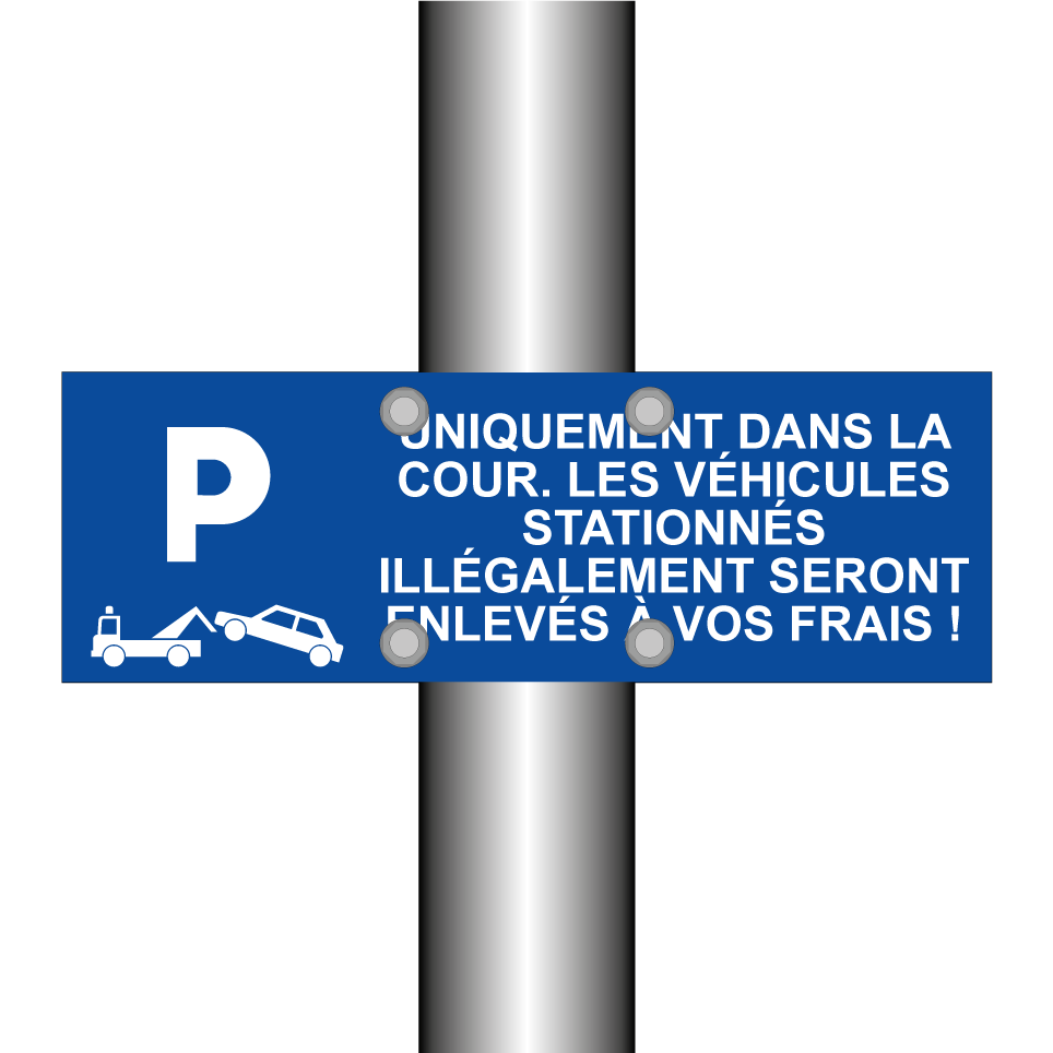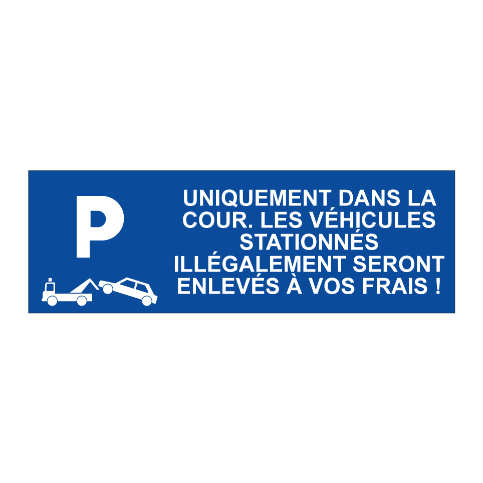 Panneau de stationnement avec le texte : "Uniquement dans la cour. Les véhicules stationnés illégalement seront enlevés à vos frais !" et une symbolique claire.