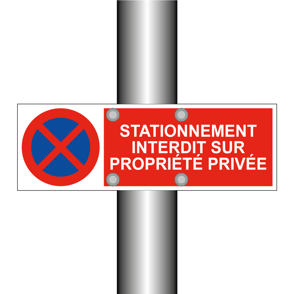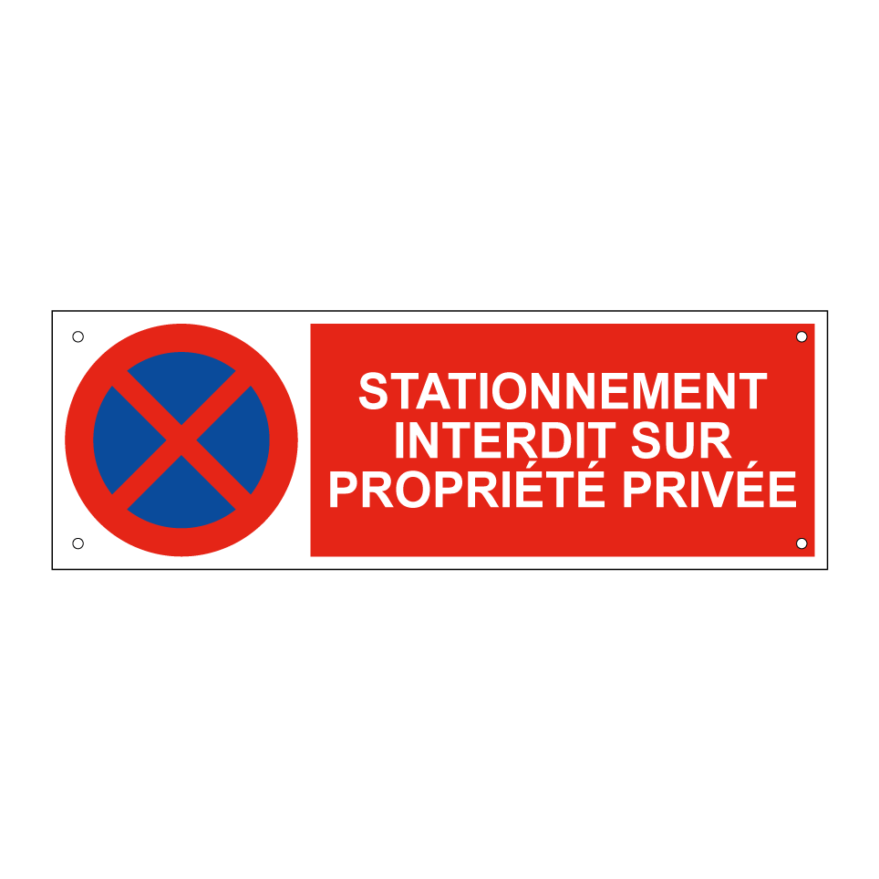 Panneau d'interdiction de stationner avec le texte : "Stationnement interdit sur propriété privée" et une symbolique claire.