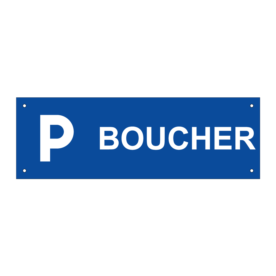 Le panneau de stationnement "Boucher" est idéal pour indiquer des zones de stationnement réservées ou spécifiques. Grâce à son fond bleu et son texte blanc, il est facilement visible et attire l'attention. Ce panneau peut être installé dans des parkings privés, des zones commerciales ou des espaces publics pour guider les conducteurs. Sa conception claire et son symbole distinctif assurent une compréhension immédiate, facilitant ainsi la gestion du stationnement et améliorant l'organisation des espaces de stationnement.