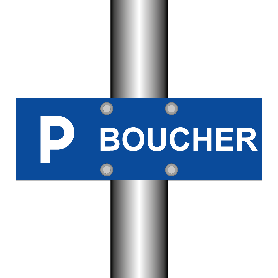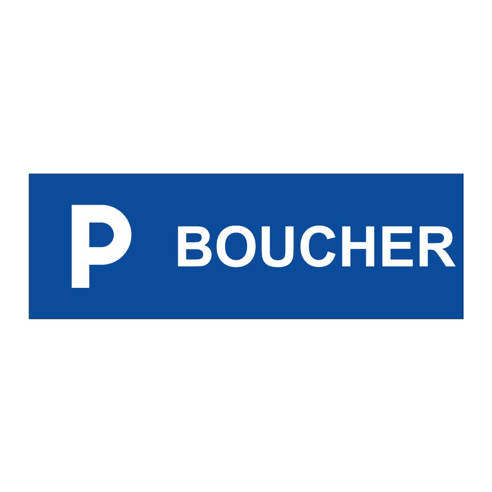 Panneau de stationnement avec le texte : "Boucher" et une symbolique claire.