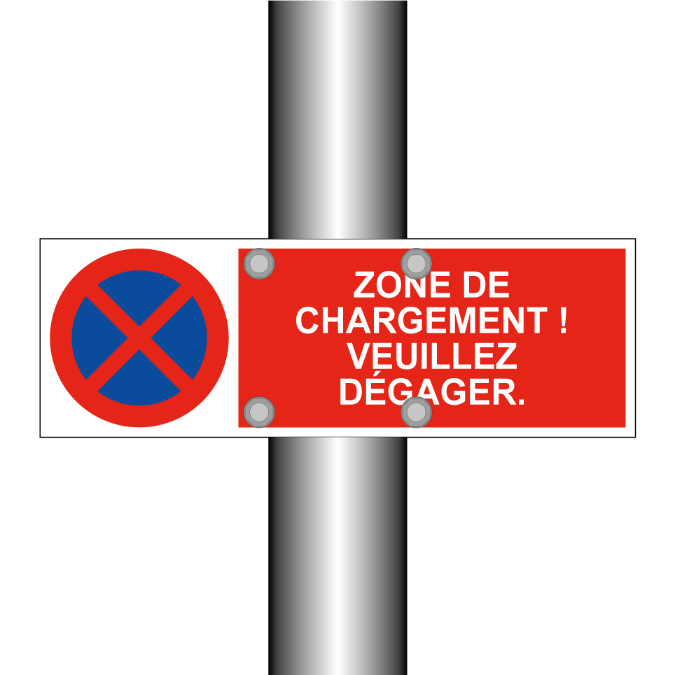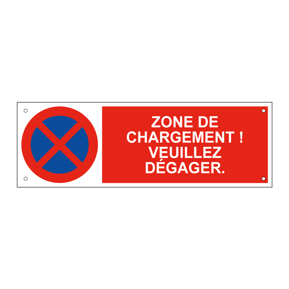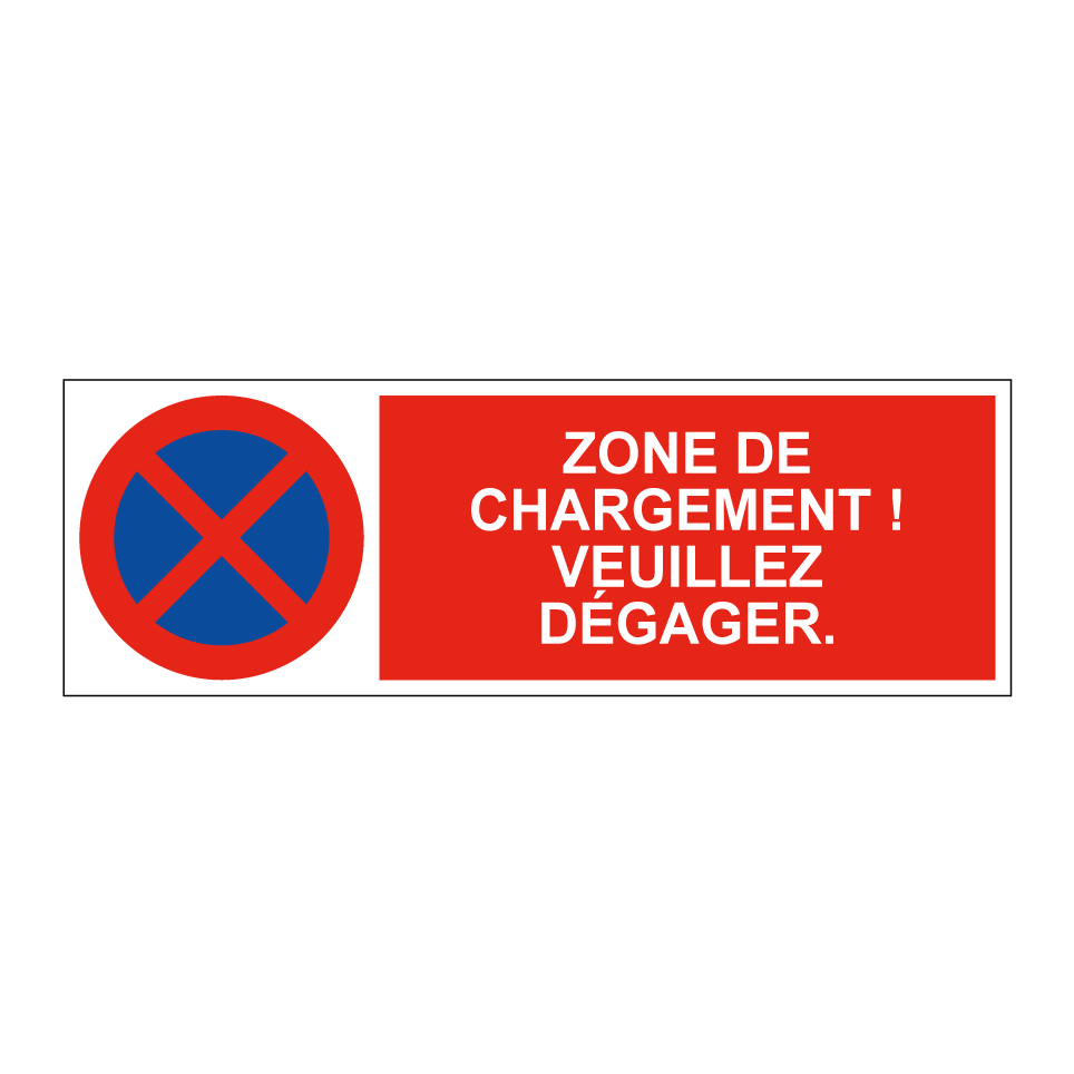 Panneau d'interdiction de stationner avec le texte : "Zone de chargement ! Veuillez dégager." et une symbolique claire.