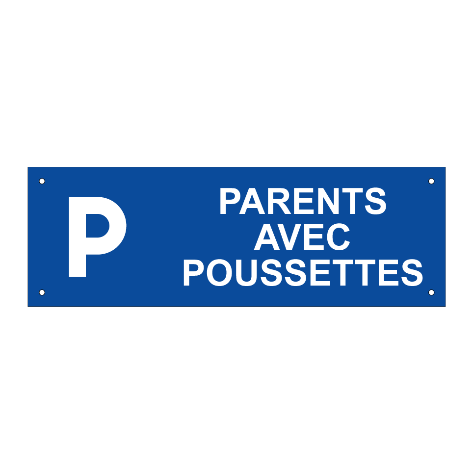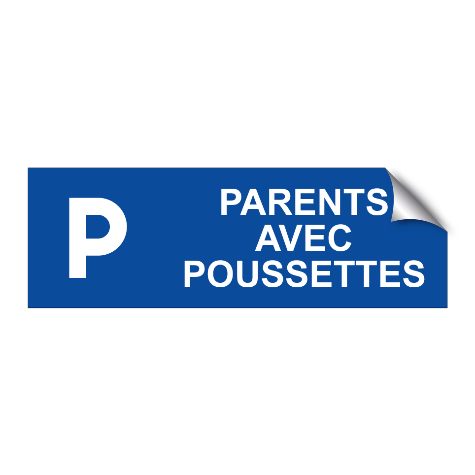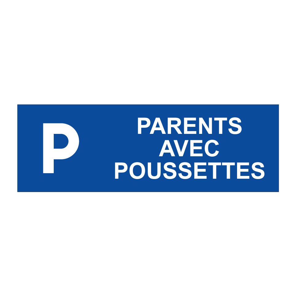 Panneau de stationnement avec le texte : "Parents avec poussettes" et une symbolique claire.