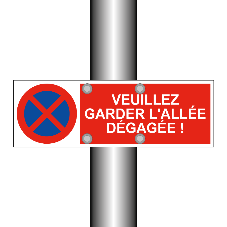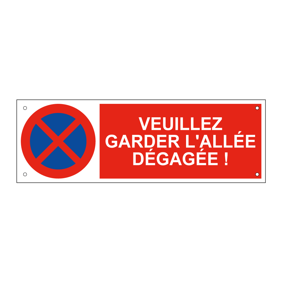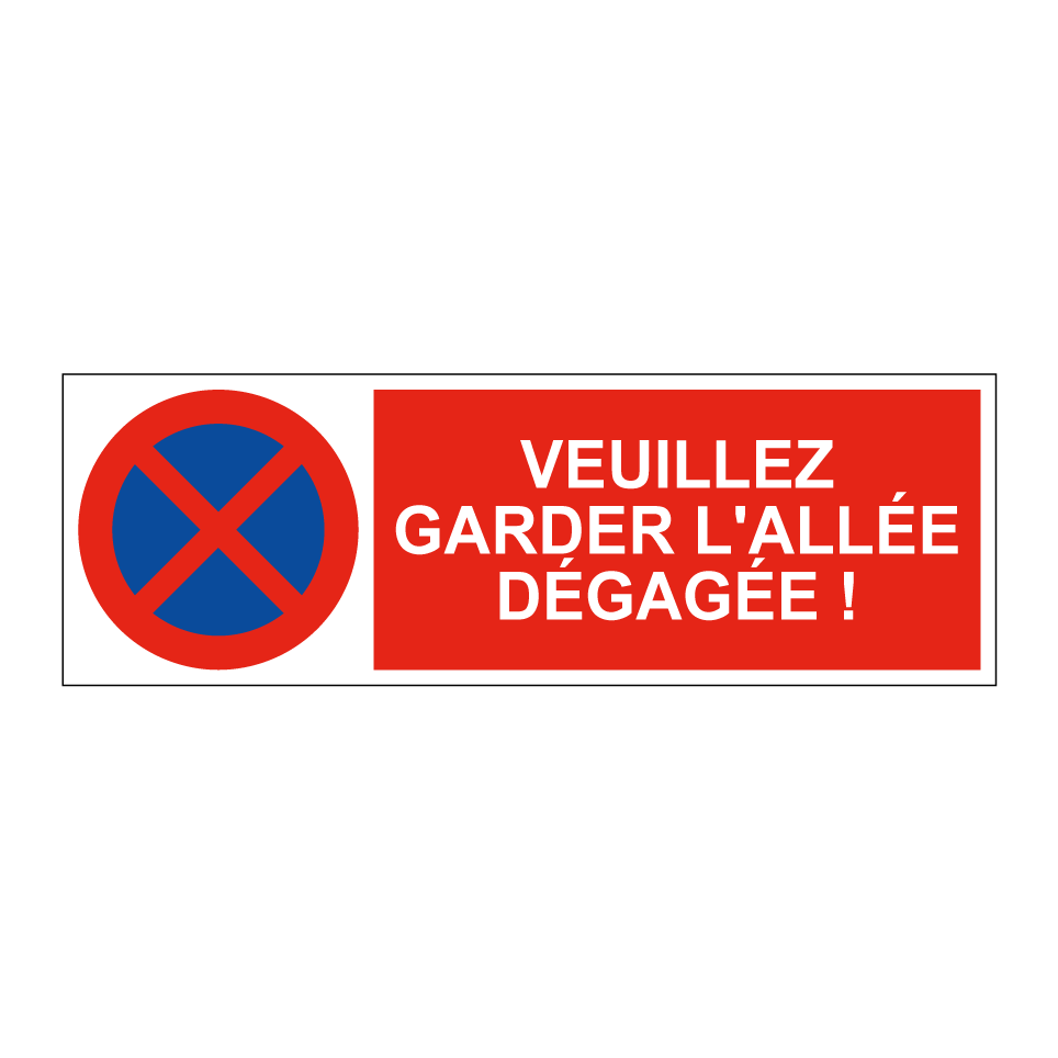 Panneau d'interdiction de stationner avec le texte : "Veuillez garder l'allée dégagée !" et une symbolique claire.
