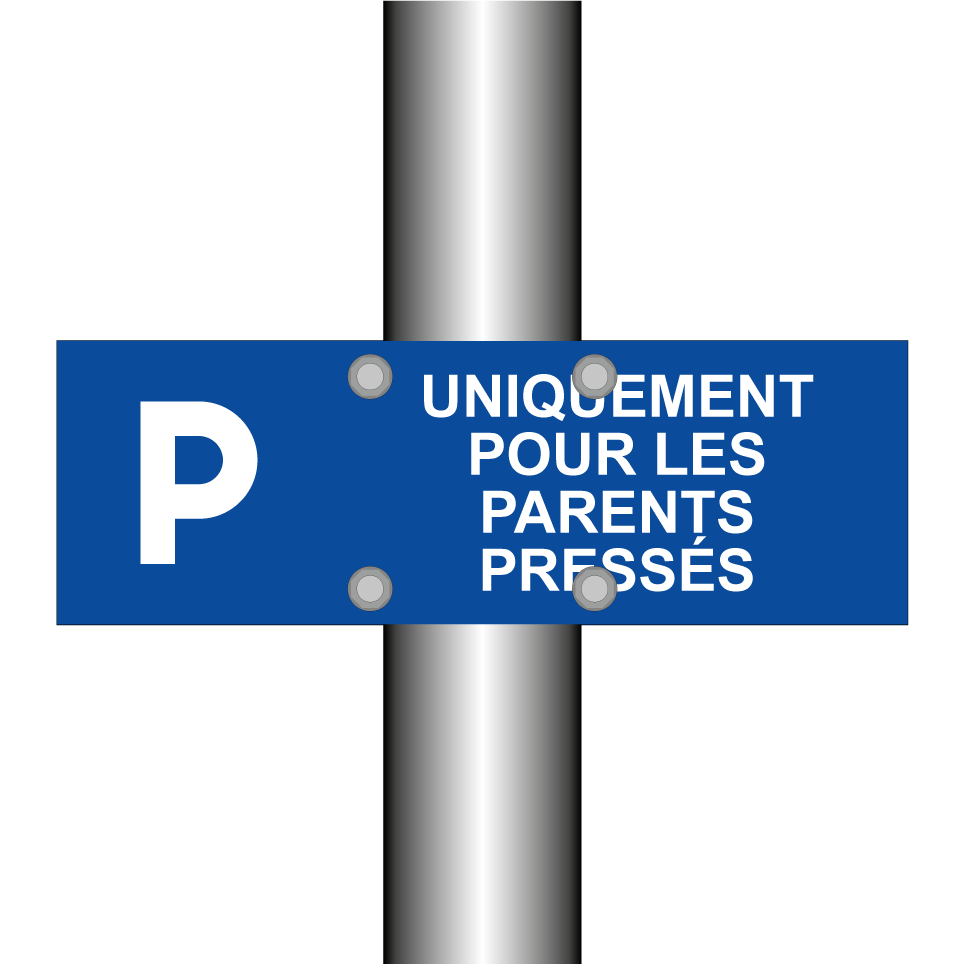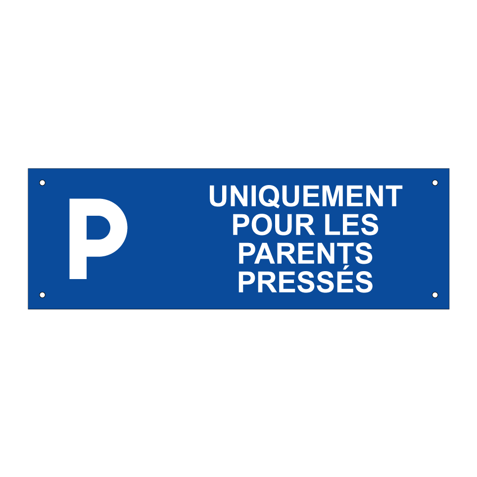 Panneau de stationnement avec le texte : "Uniquement pour les parents pressés" et une symbolique claire.