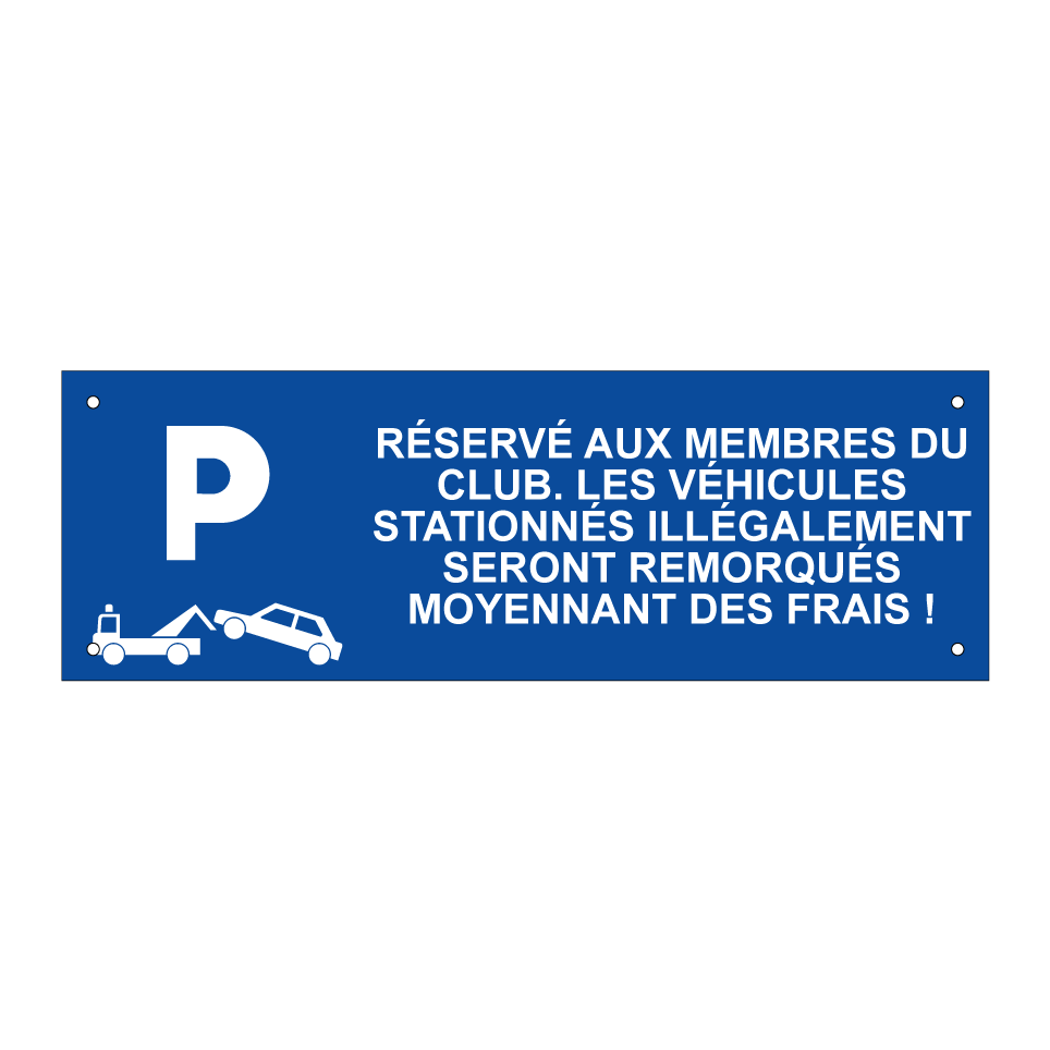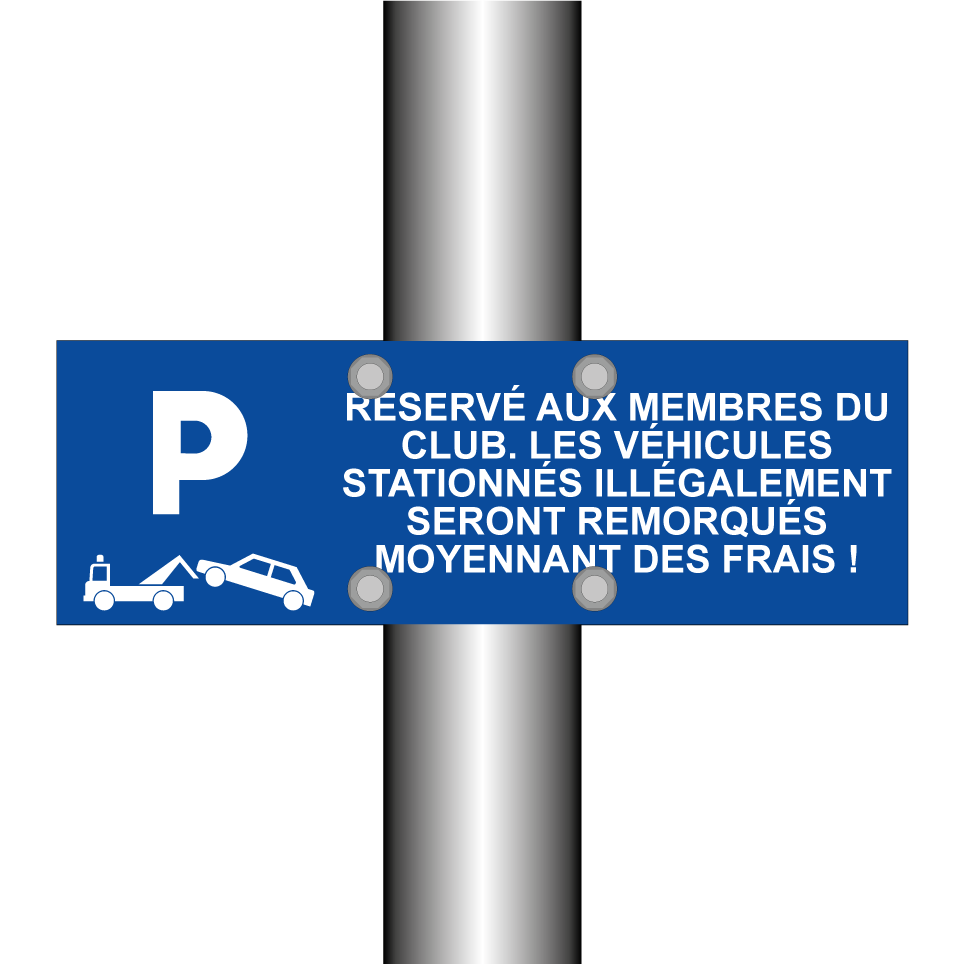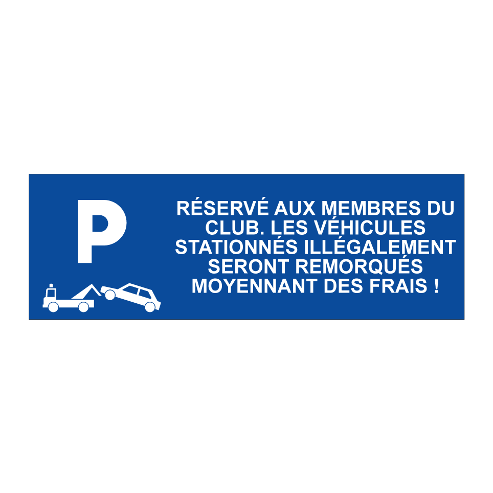 Panneau de stationnement avec le texte : "Réservé aux membres du club. Les véhicules stationnés illégalement seront remorqués moyennant des frais !" et une symbolique claire.