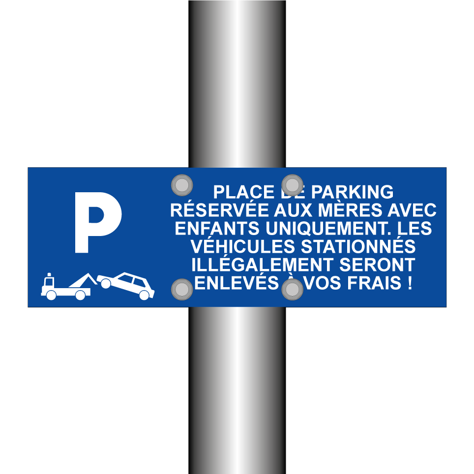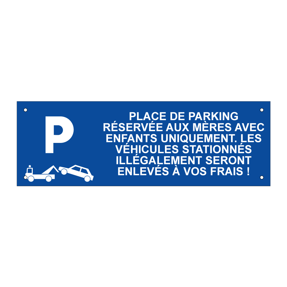 Panneau de stationnement avec le texte : "Place de parking réservée aux mères avec enfants uniquement. Les véhicules stationnés illégalement seront enlevés à vos frais !" et une symbolique claire.