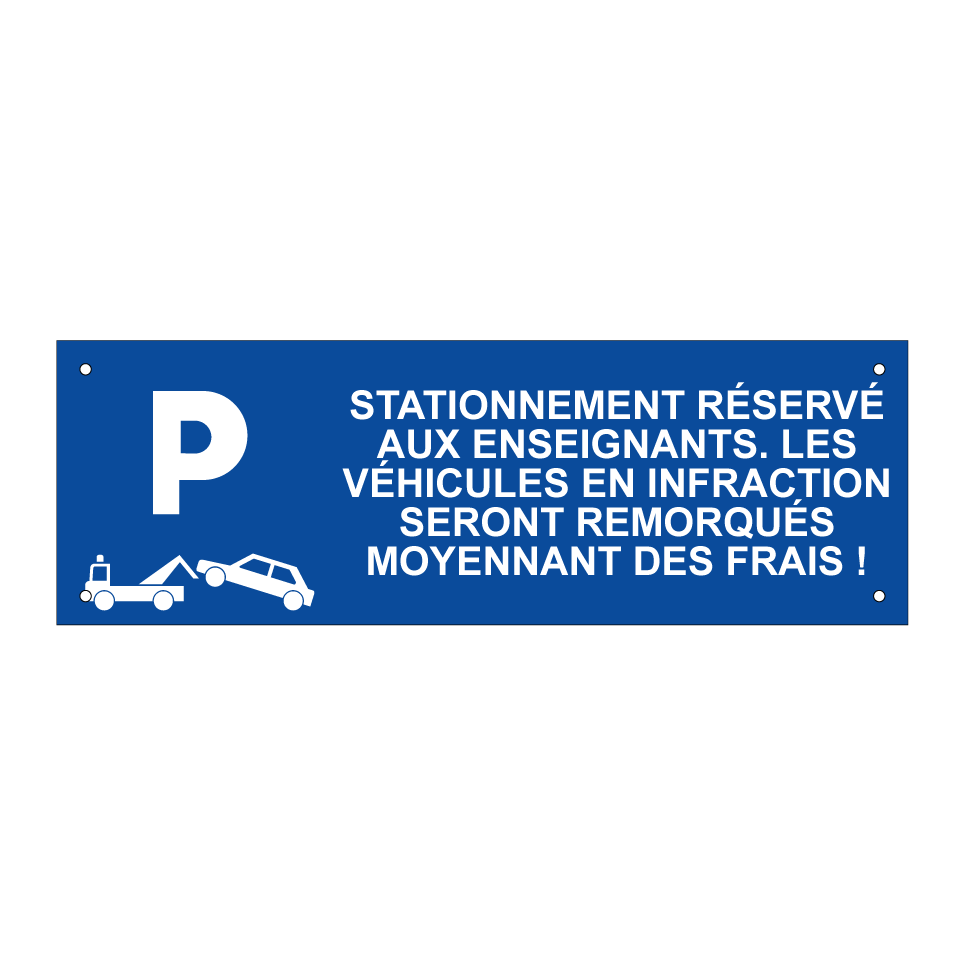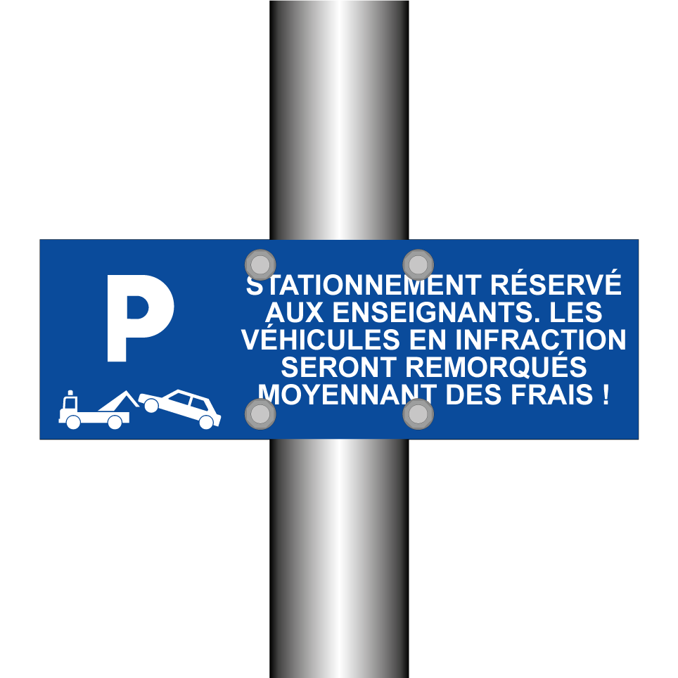 Panneau de stationnement avec le texte : "Stationnement réservé aux enseignants. Les véhicules en infraction seront remorqués moyennant des frais !" et une symbolique claire.