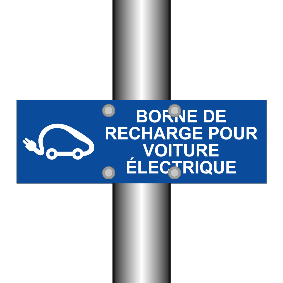 Panneau de stationnement avec le texte : "Borne de recharge pour voiture électrique" et une symbolique claire.