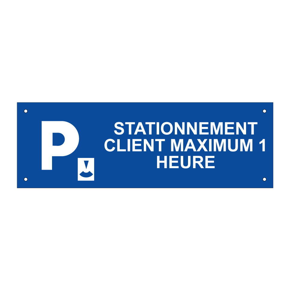 Panneau de stationnement avec le texte : "Stationnement client maximum 1 heure" et une symbolique claire.