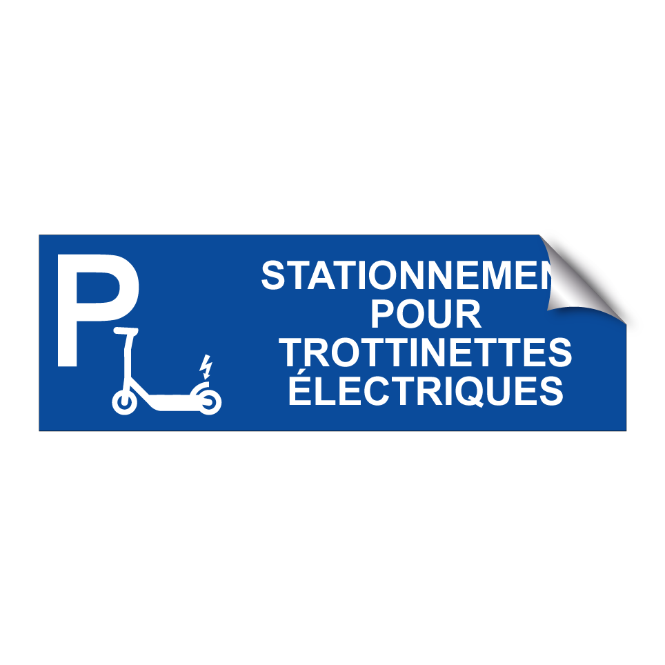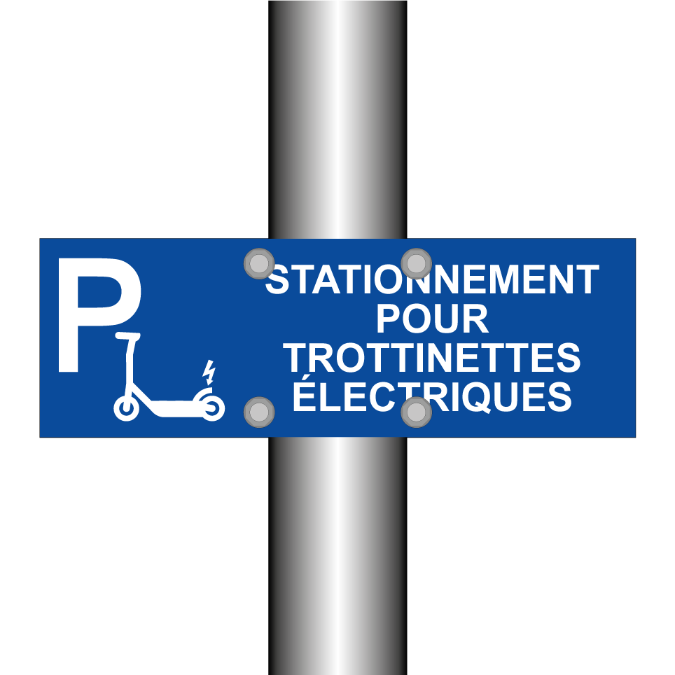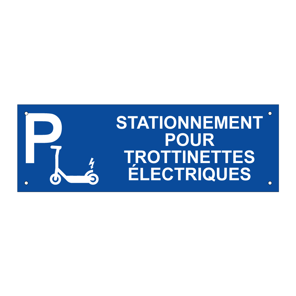 Panneau de stationnement avec le texte : "Stationnement pour trottinettes électriques" et une symbolique claire.