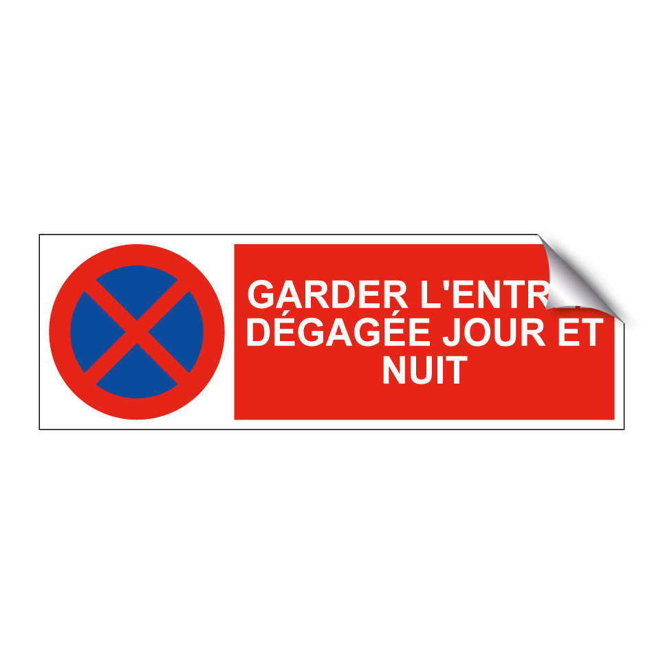 Panneau d'interdiction de stationner avec le texte : "Garder l'entrée dégagée jour et nuit" et une symbolique claire.