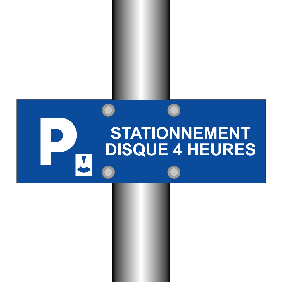 Panneau de stationnement avec le texte : "Stationnement disque 4 heures" et une symbolique claire.