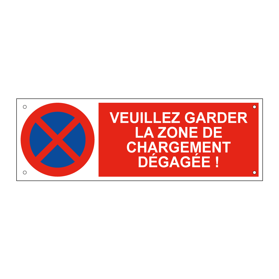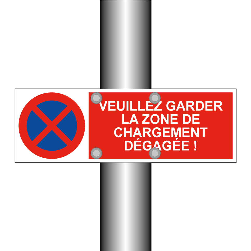 Panneau d'interdiction de stationner avec le texte : "Veuillez garder la zone de chargement dégagée !" et une symbolique claire.