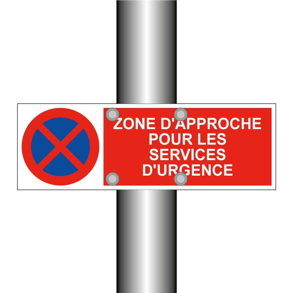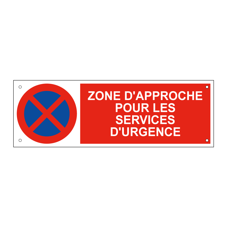 Panneau d'interdiction de stationner avec le texte : "Zone d'approche pour les services d'urgence" et une symbolique claire.