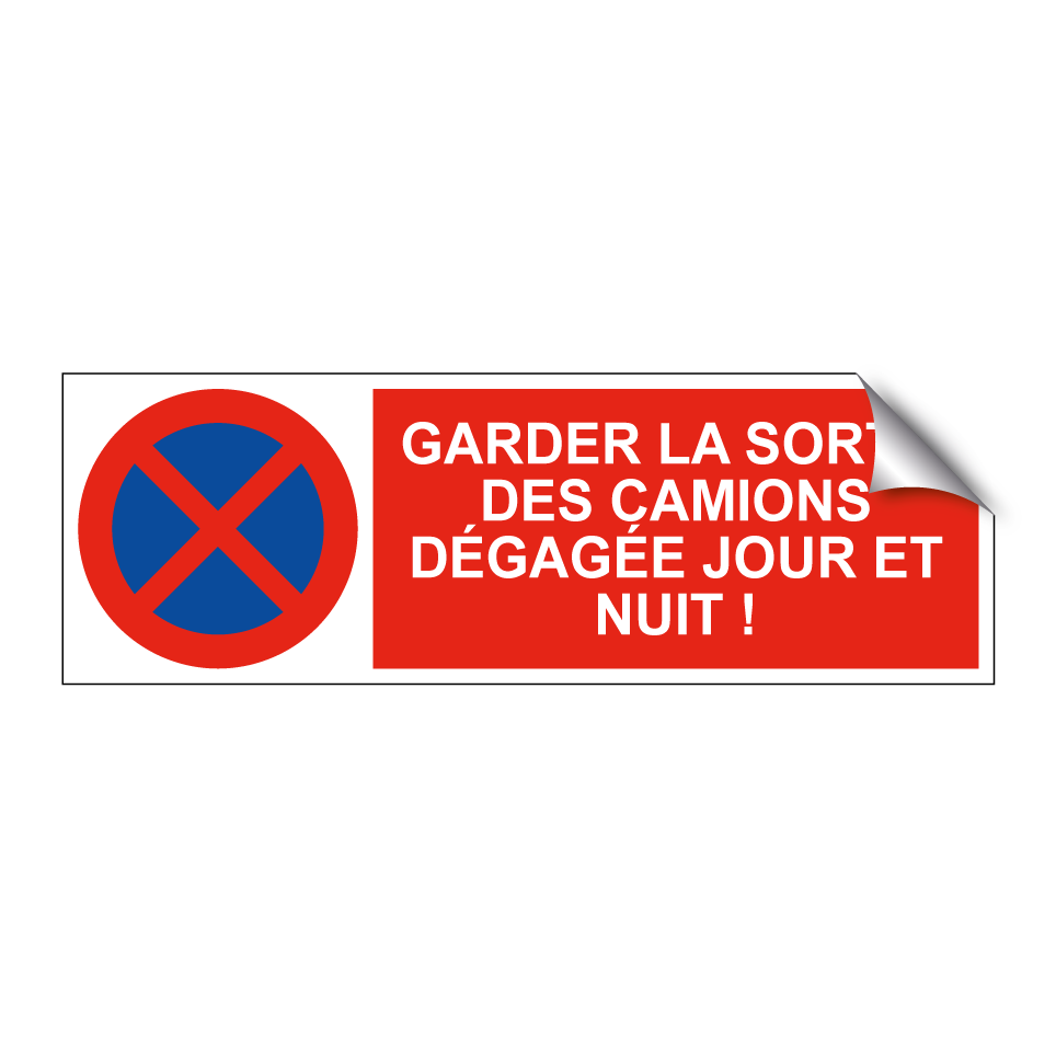 Panneau d'interdiction de stationner avec le texte : "Garder la sortie des camions dégagée jour et nuit !" et une symbolique claire.